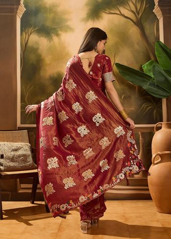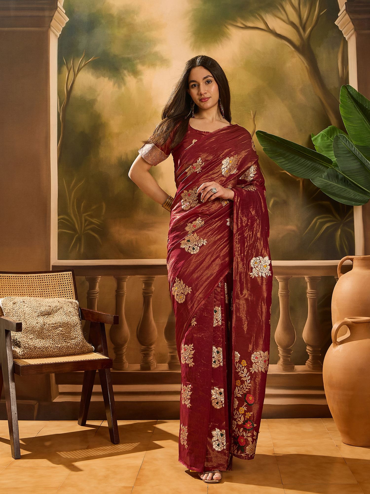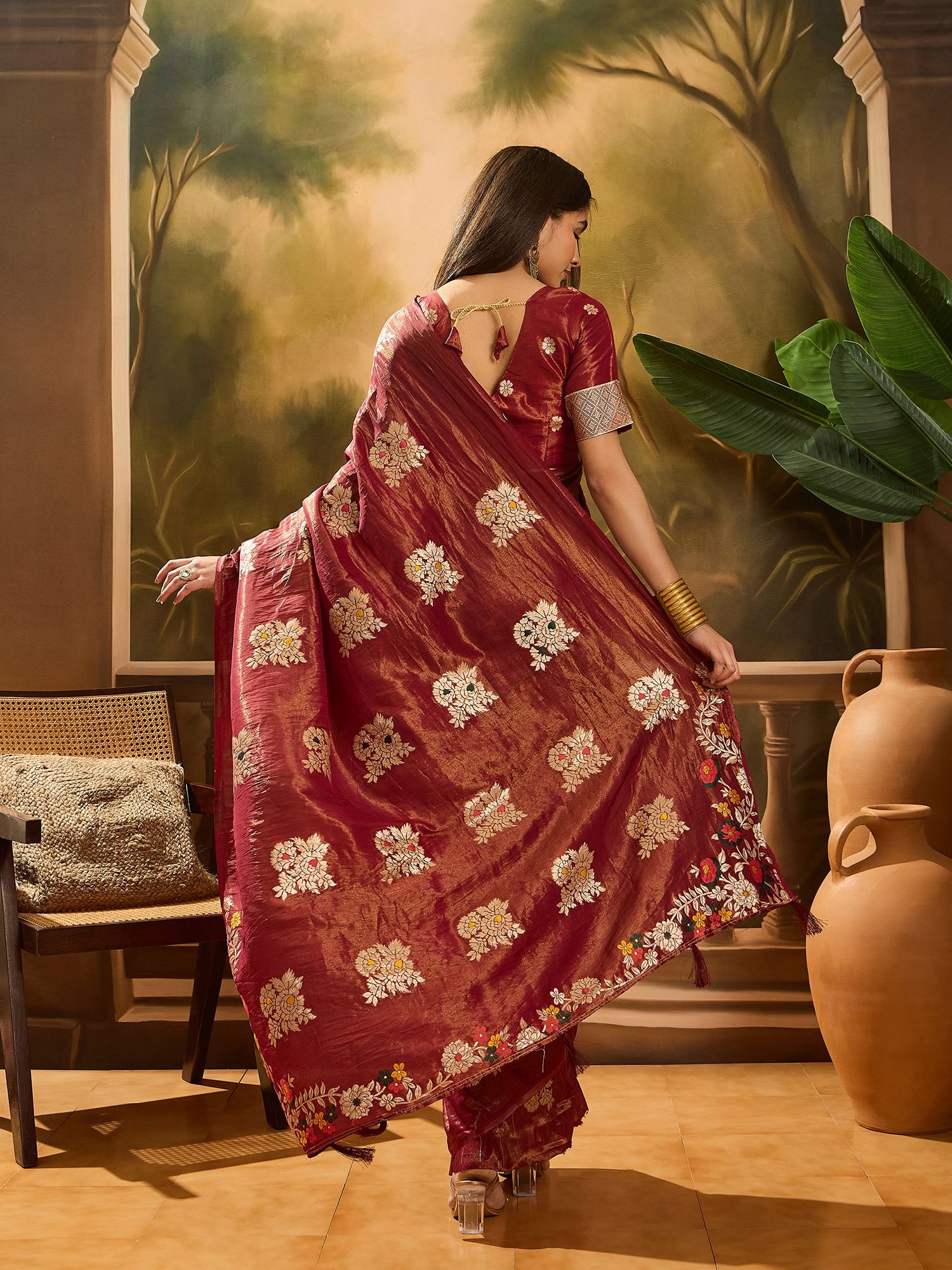 Maroon Shimmer Silk Woven Jacquard Designer Traditional Partywear Saree