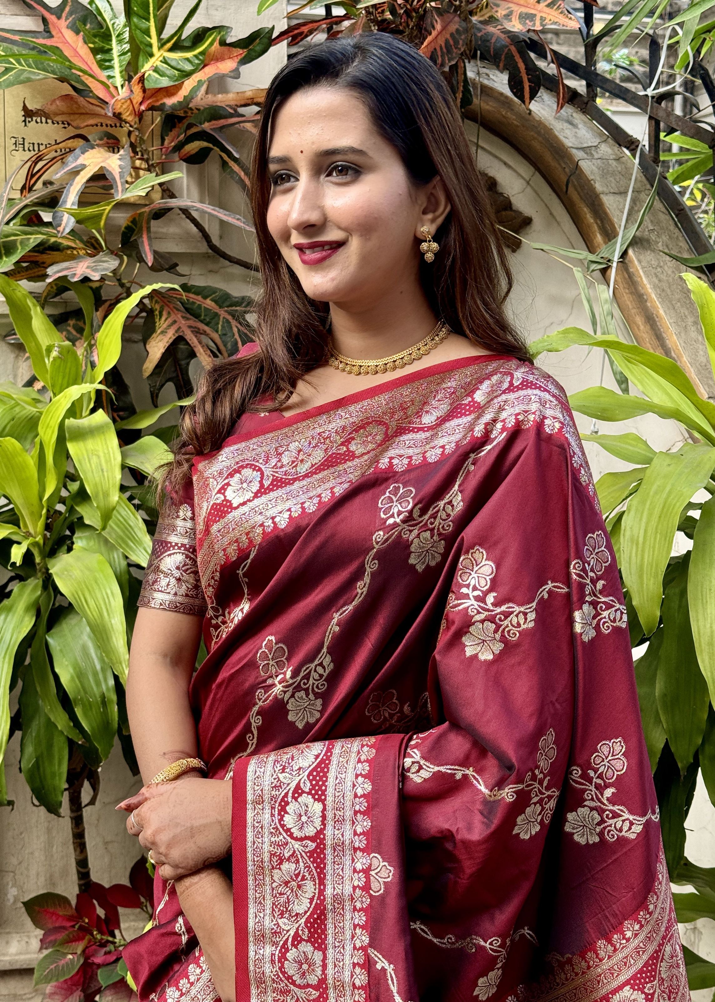 Paired with a matching maroon silk blouse, this saree provides a coordinated and elegant look. The rich yet lightweight Banarasi silk fabric drapes gracefully, ensuring comfort throughout long celebrations. Complete your festive ensemble with statement jewelry, stylish heels, and ethnic accessories to create a striking, attention-grabbing outfit. Designed for women who value authentic silk artistry, this saree beautifully blends tradition, opulence, and contemporary style.