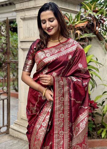 Maroon Woven Jacquard Jari Designer Banarasi Silk Festive Ceremonial Saree