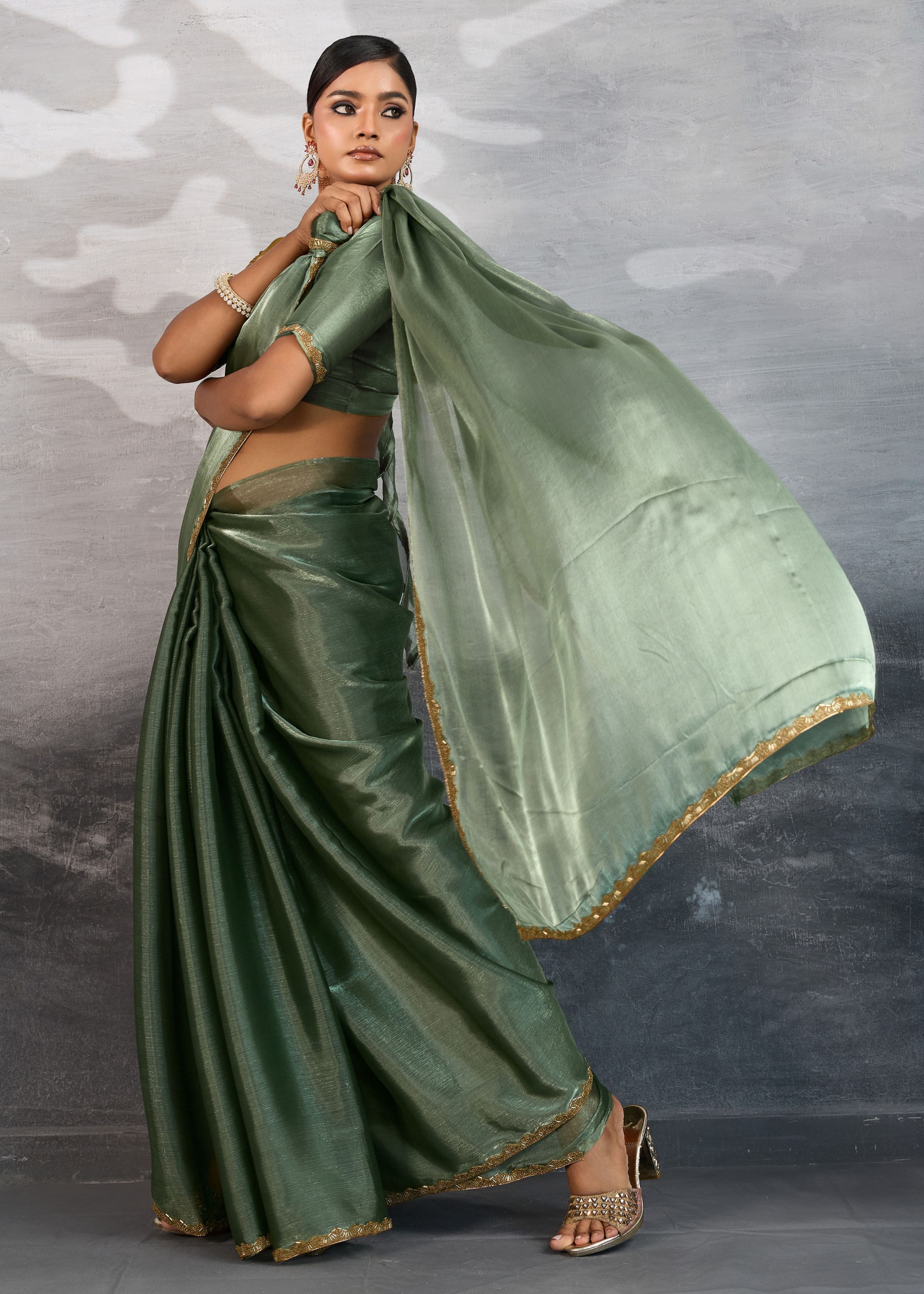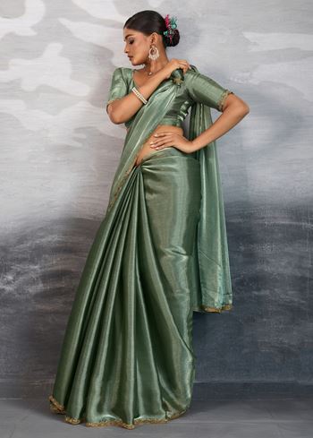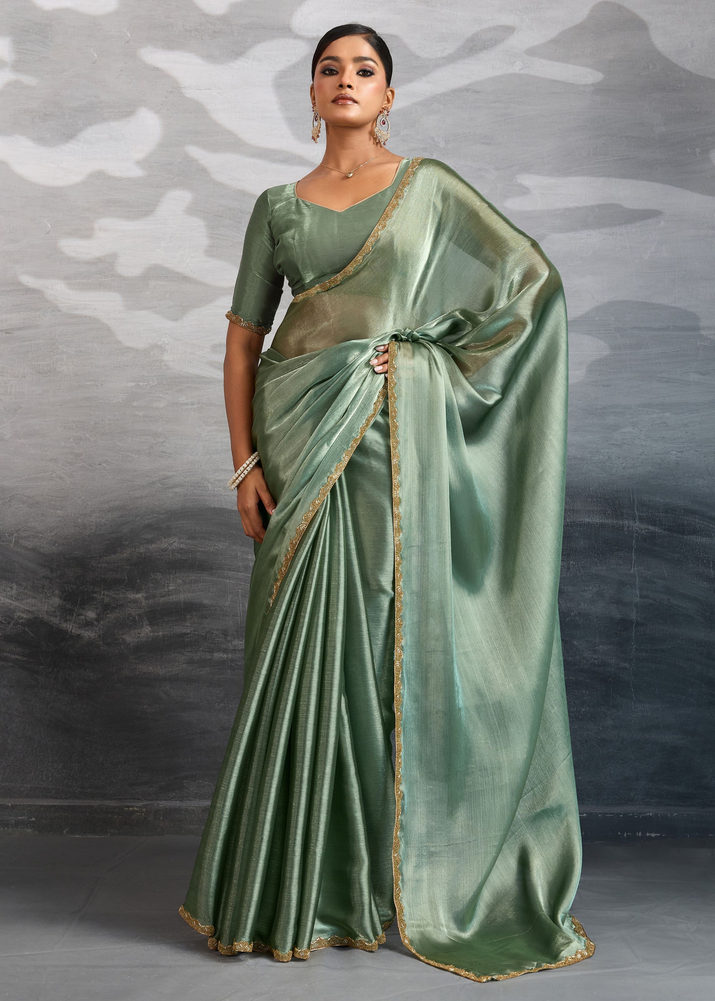 Mehendi Burberry Chiffon Saree with Beads and Cutdana Lace