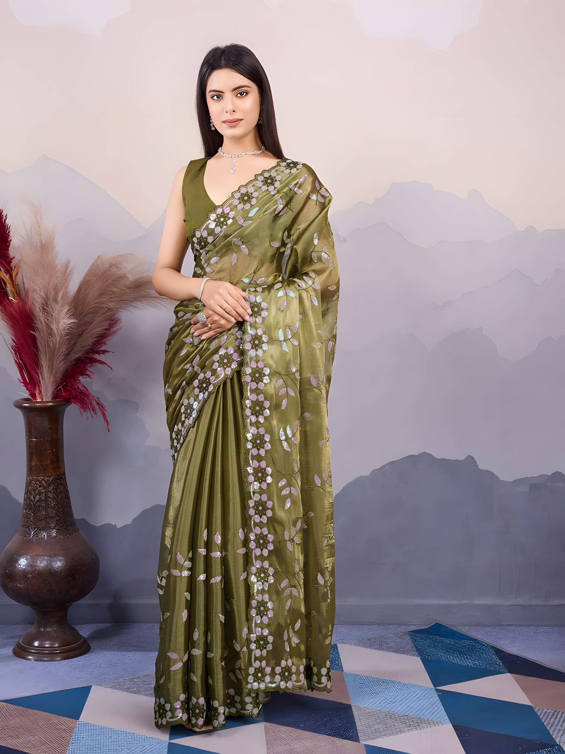Celebrate cultural beauty with Aethnofit Fashions’ Mahendi Burberry Silk Saree—an elegant blend of earthy charm and sophisticated craftsmanship. Featuring detailed C-Pallu embroidery and fine sequin accents, this saree is perfect for traditional festivities, mehendi functions, or evening rituals steeped in heritage.