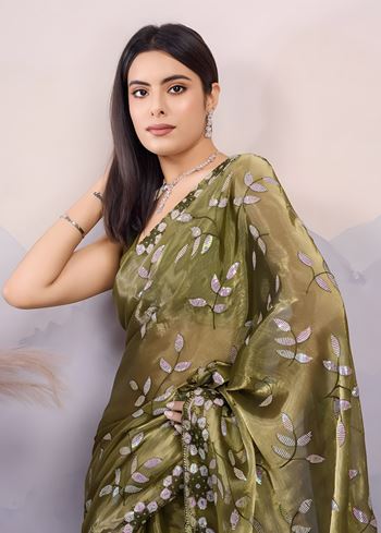 Mehendi Burberry Silk Saree with C-Pallu Embroidery and Sequins Work