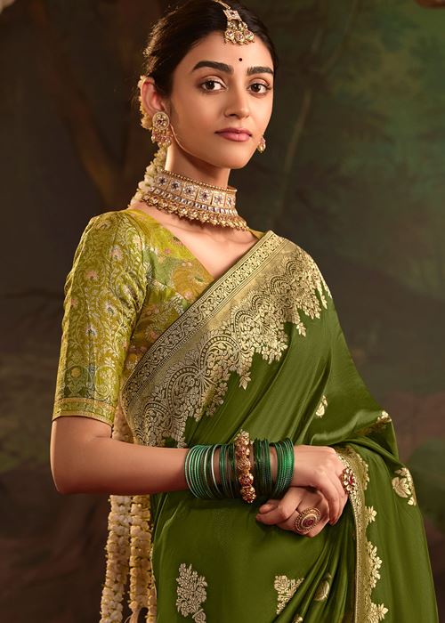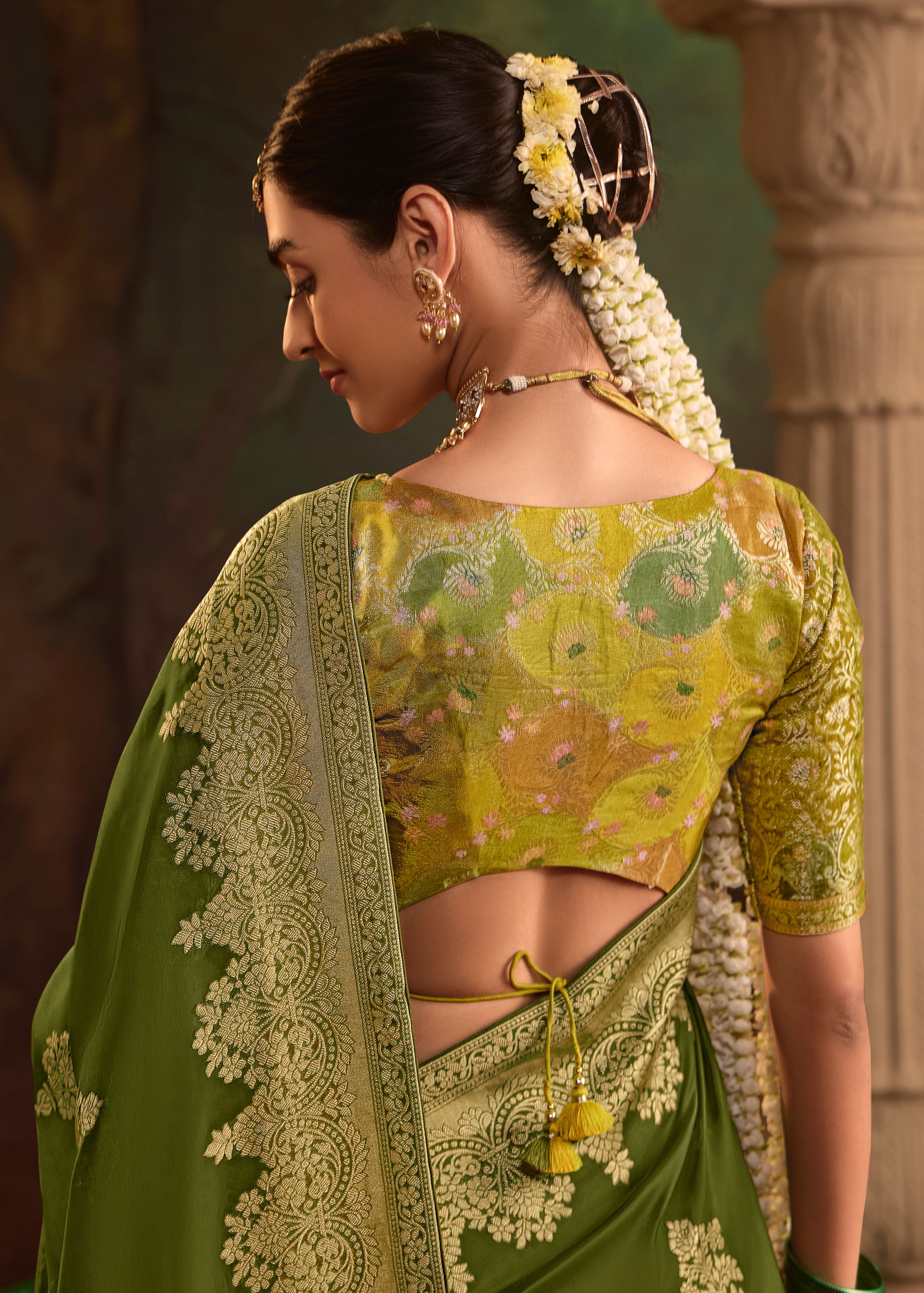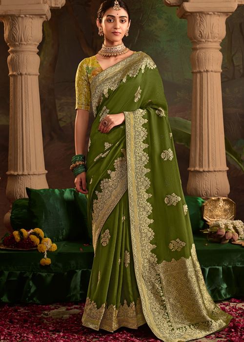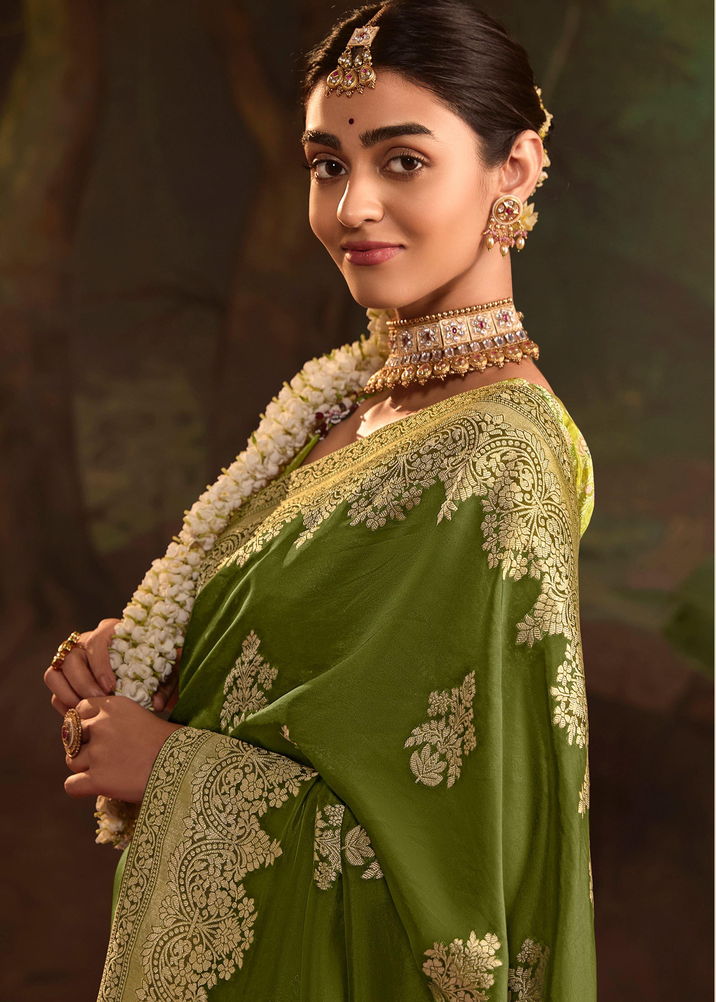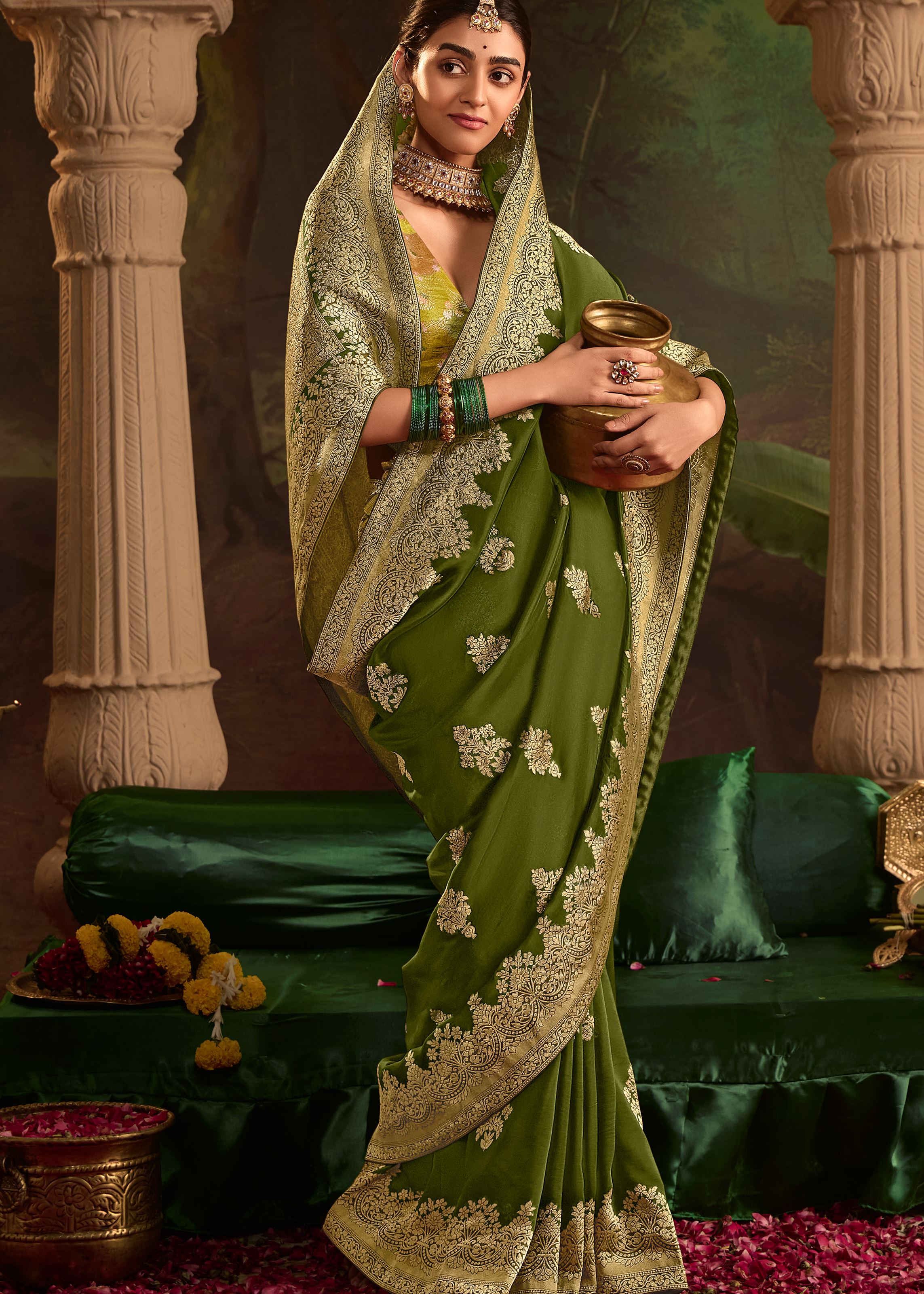 Mehendi Pure Crepe Dola Silk Saree With Jacquard Woven Work