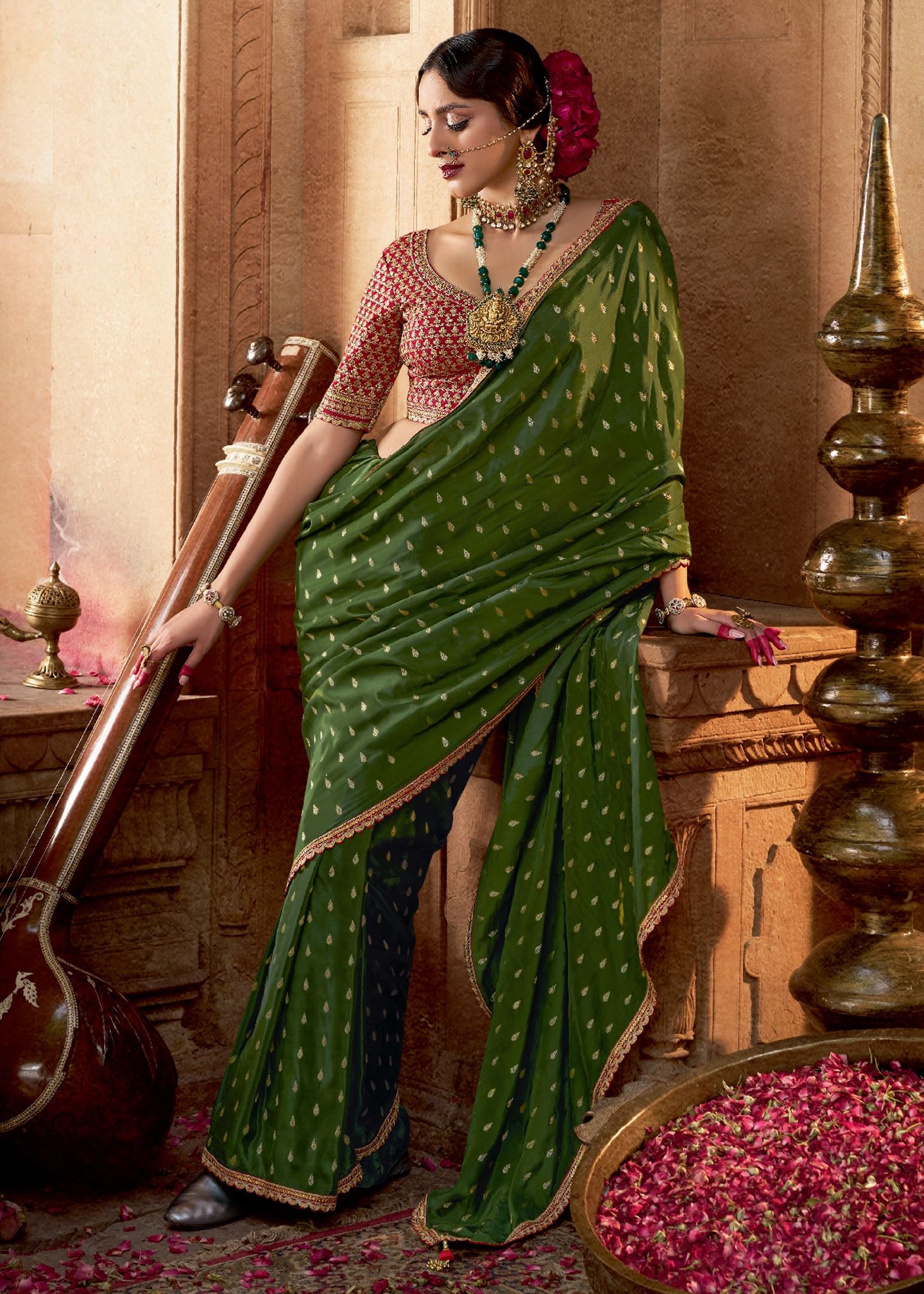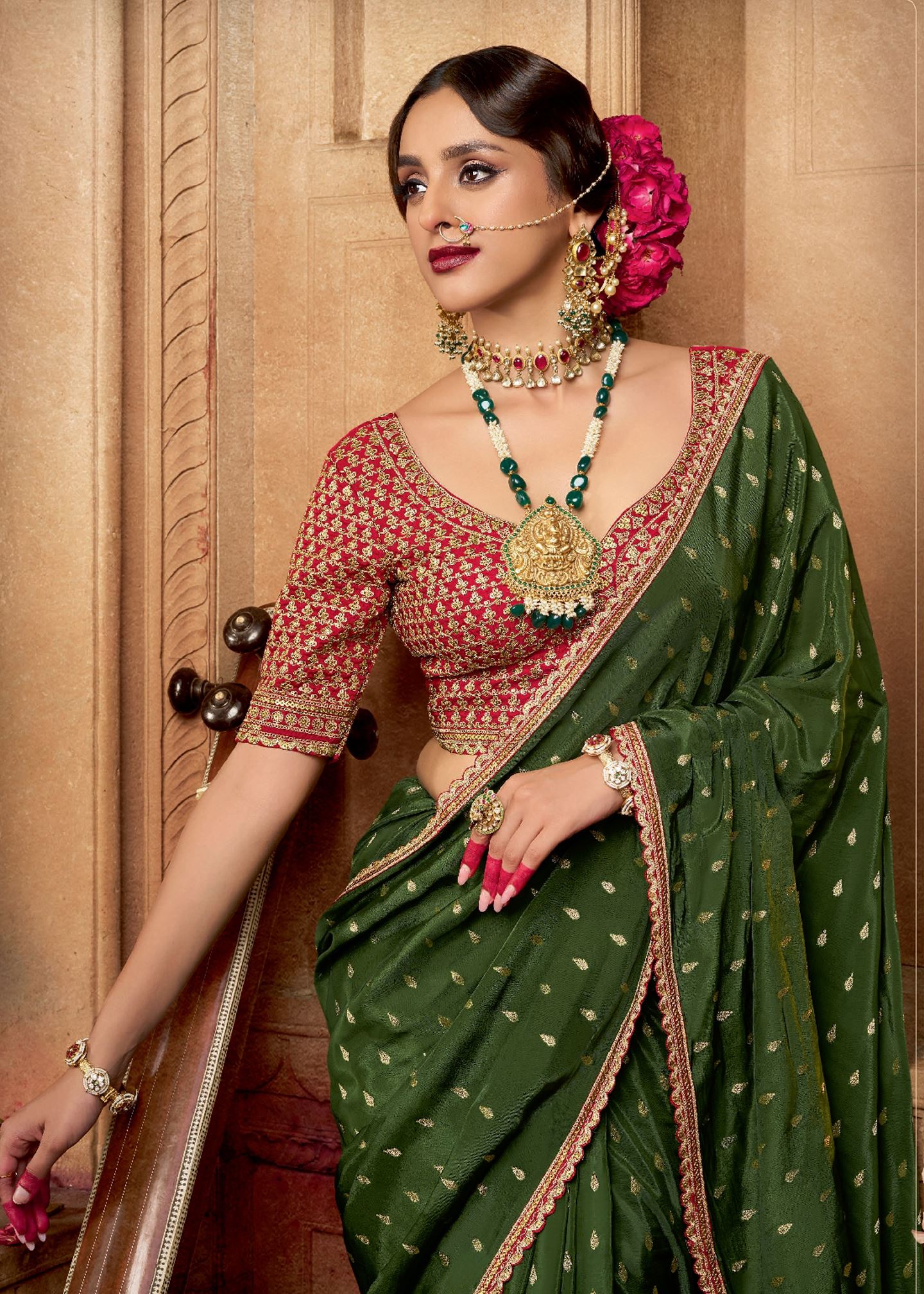 Mehendi Viscose Crepe Saree with Butti Weaving and Embroidered Blouse