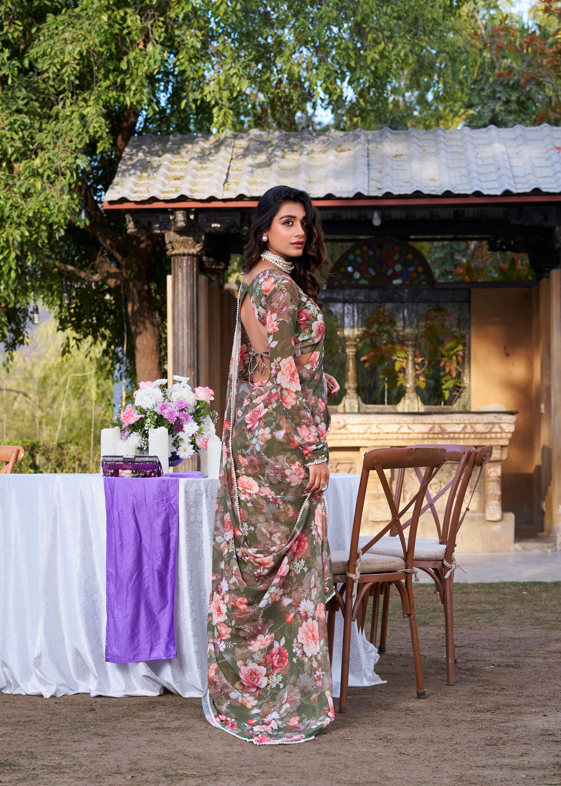 Mehendi Weightless Marble Print Saree with Pearl Lace Border