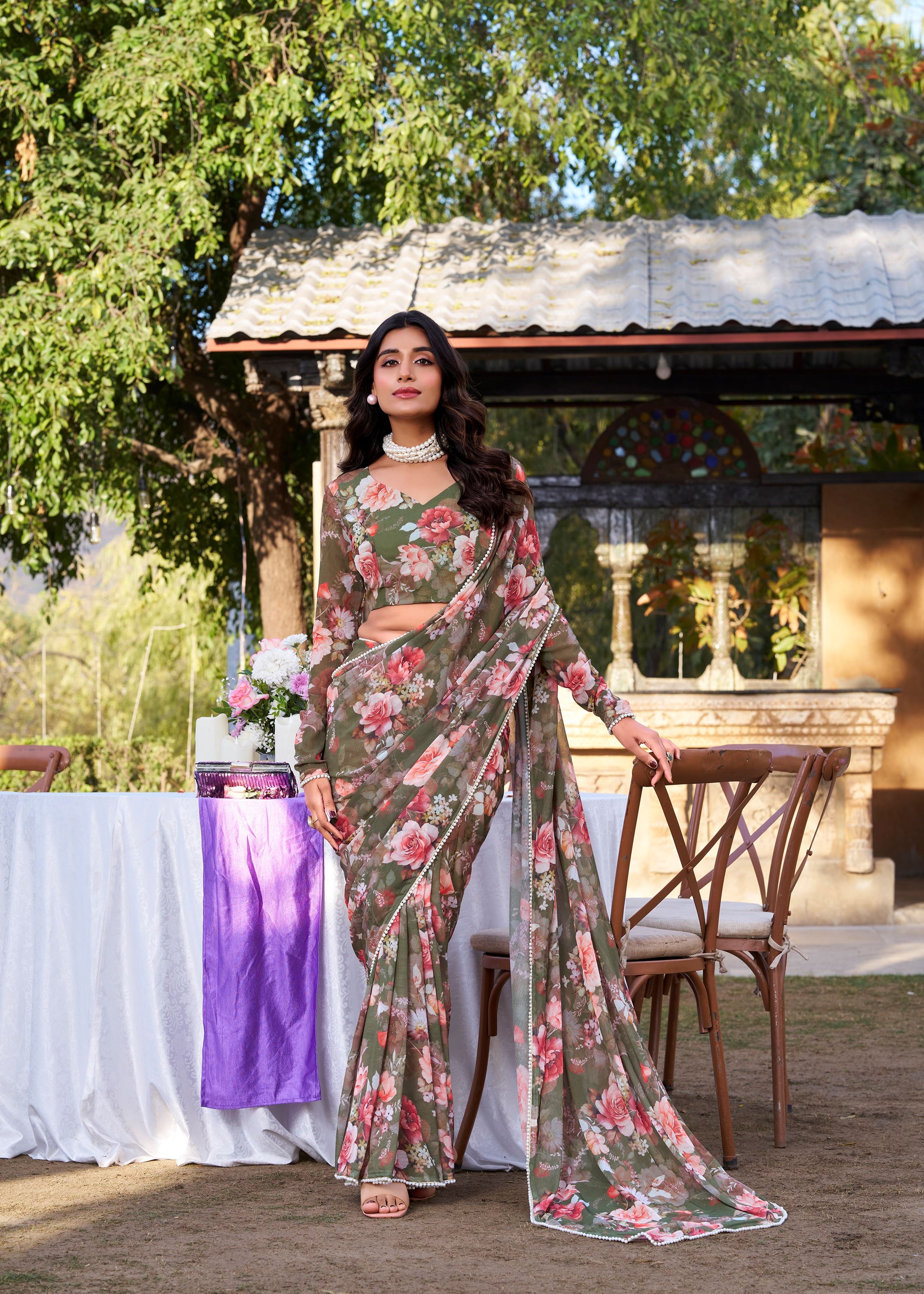 Elevate your ethnic wardrobe with our Mehendi Weightless Marble Print Saree, crafted from soft and flowing georgette fabric that offers both comfort and style. The soothing mehendi shade features an elegant marble print, perfectly complemented by a delicate pearl lace border that adds a touch of refined sophistication. Paired with a matching mehendi georgette blouse, this saree is ideal for festive occasions, weddings, or any celebration where you want to stand out with understated grace. Lightweight and breathable, it promises effortless elegance all day long.