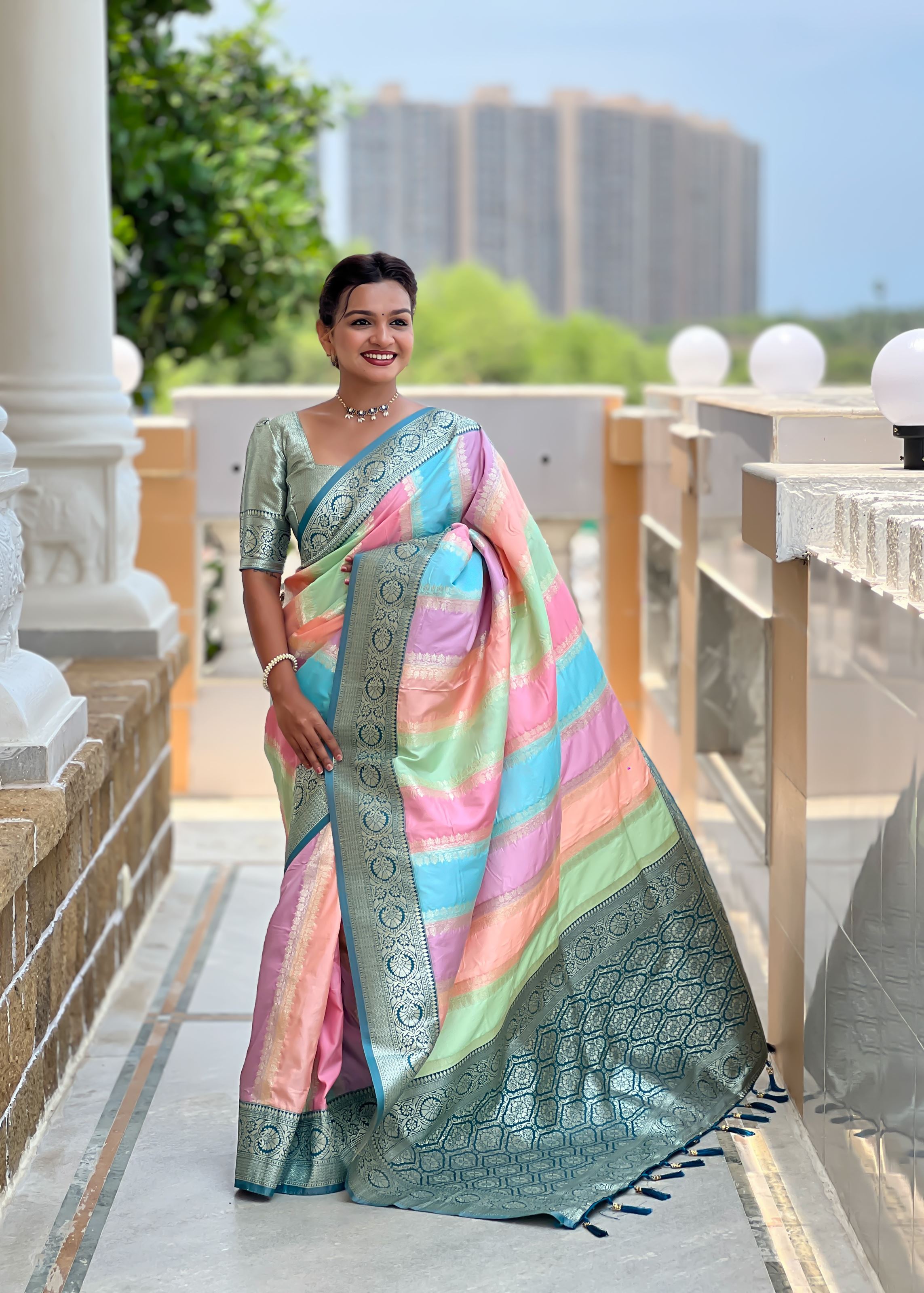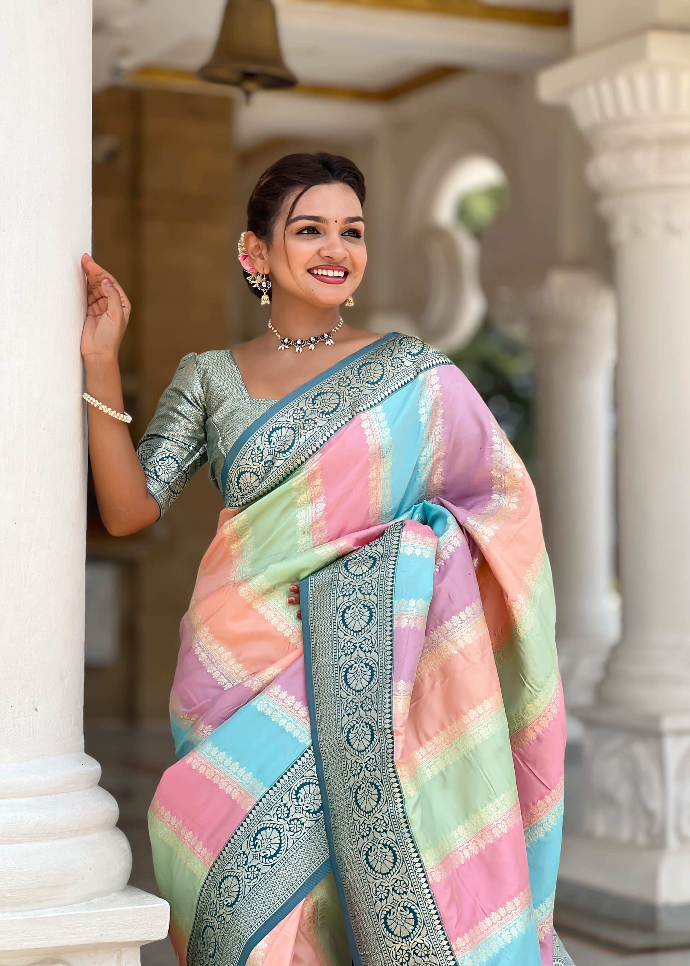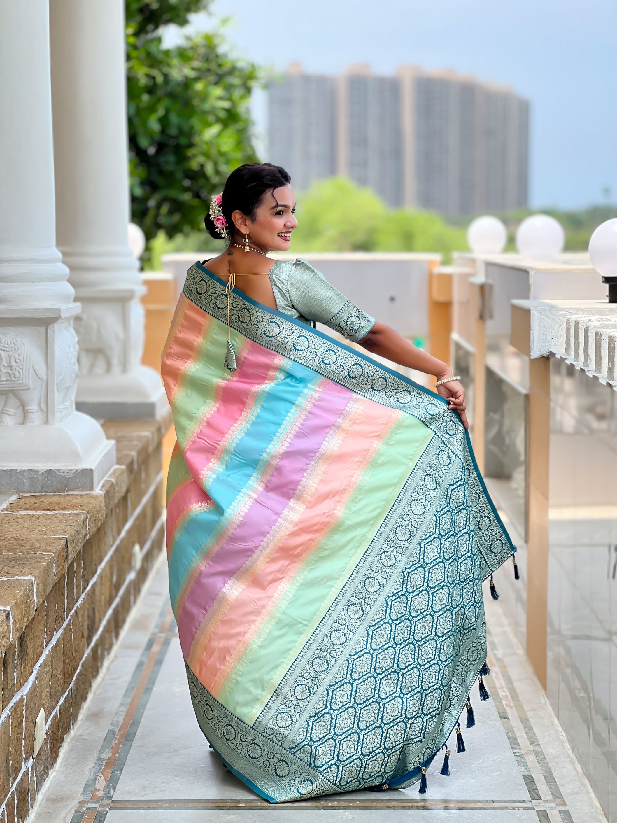 Beautifully adorned with intricate woven Jacquard patterns, this saree reflects fine artistry and luxurious detailing. The matching silk blend blouse in teal complements the saree perfectly, offering ease for customization and styling. Whether you are searching for traditional sarees, festive wear sarees, or designer ethnic outfits, this exclusive piece is a must-have in your collection.