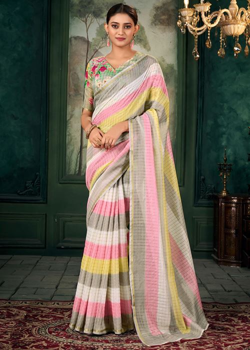 Multicolor Chanderi Linen Silk Saree With Printed With Woven Work