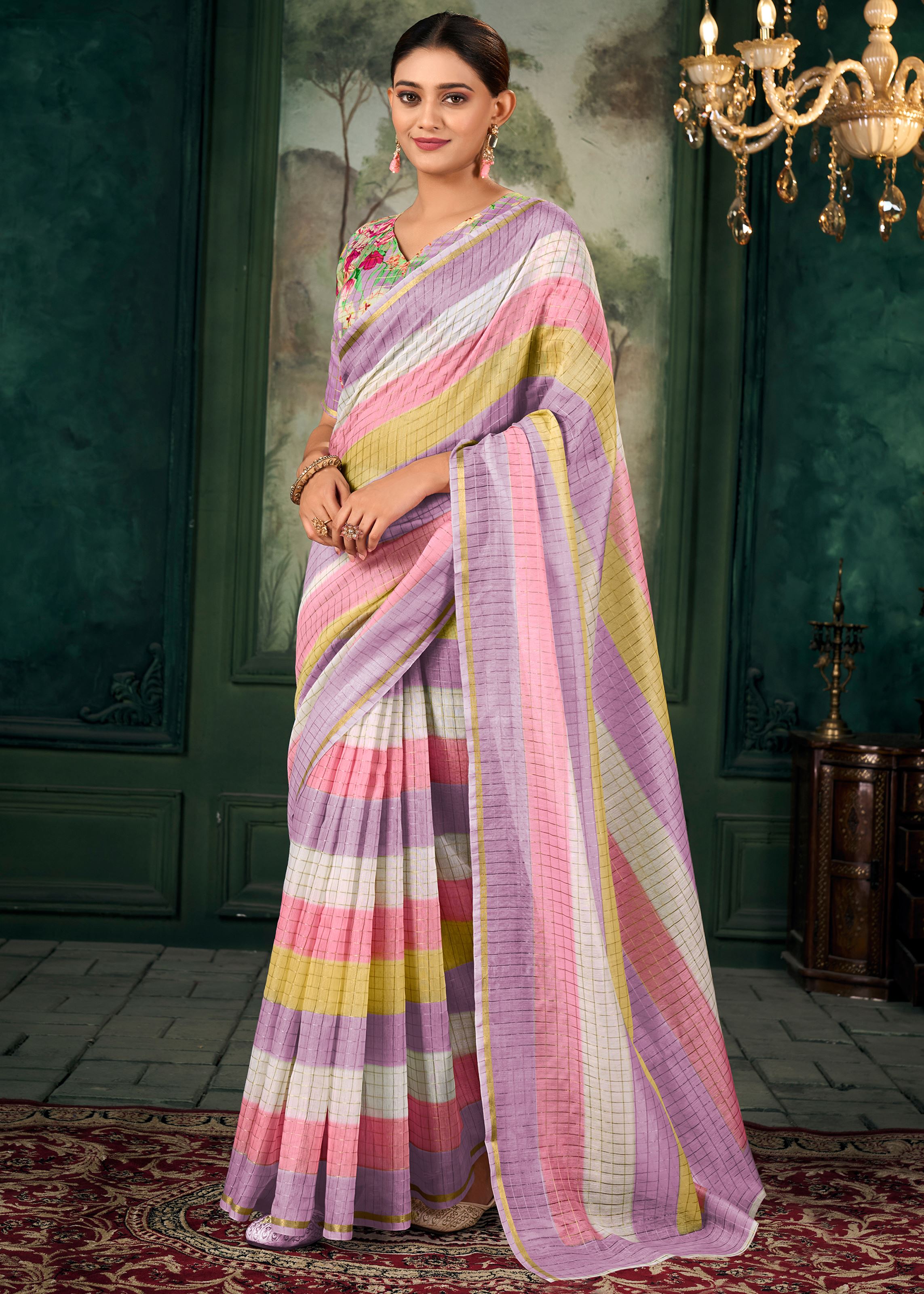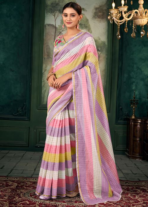 Multicolor Chanderi Linen Silk Saree With Printed With Woven Work