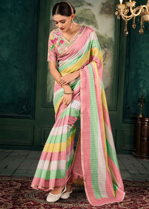 Multicolor Chanderi Linen Silk Saree With Printed With Woven Work
