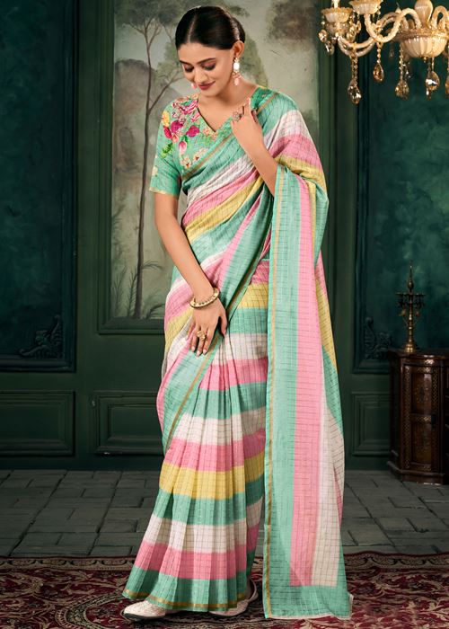Multicolor Chanderi Linen Silk Saree With Printed With Woven Work