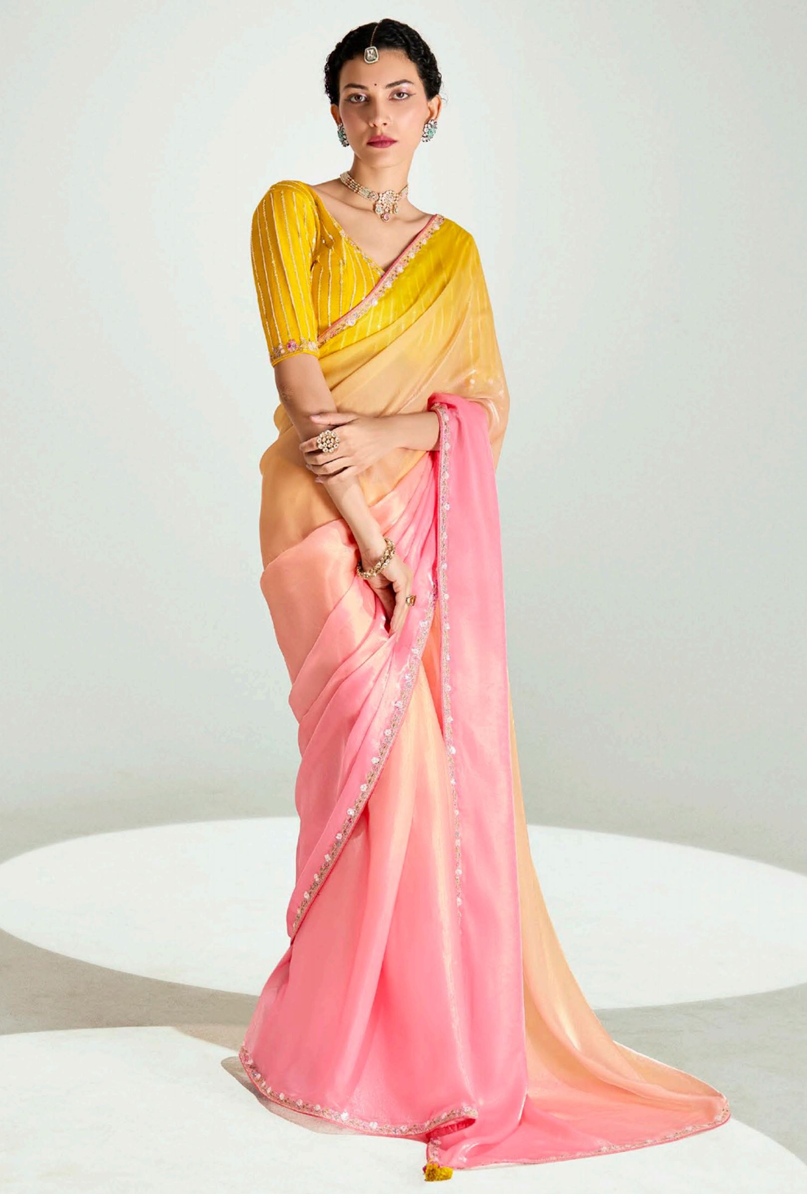 Multicolor Organza Tissue Saree With Border Work and Heavy Embroidery Work Blouse