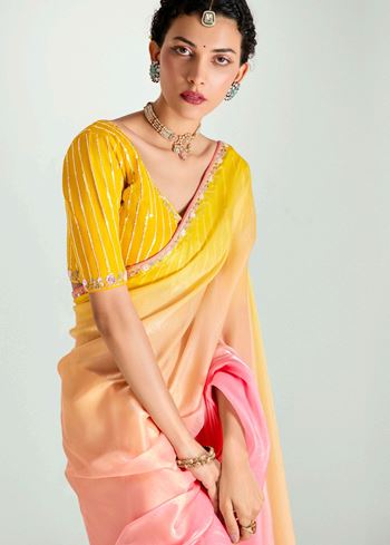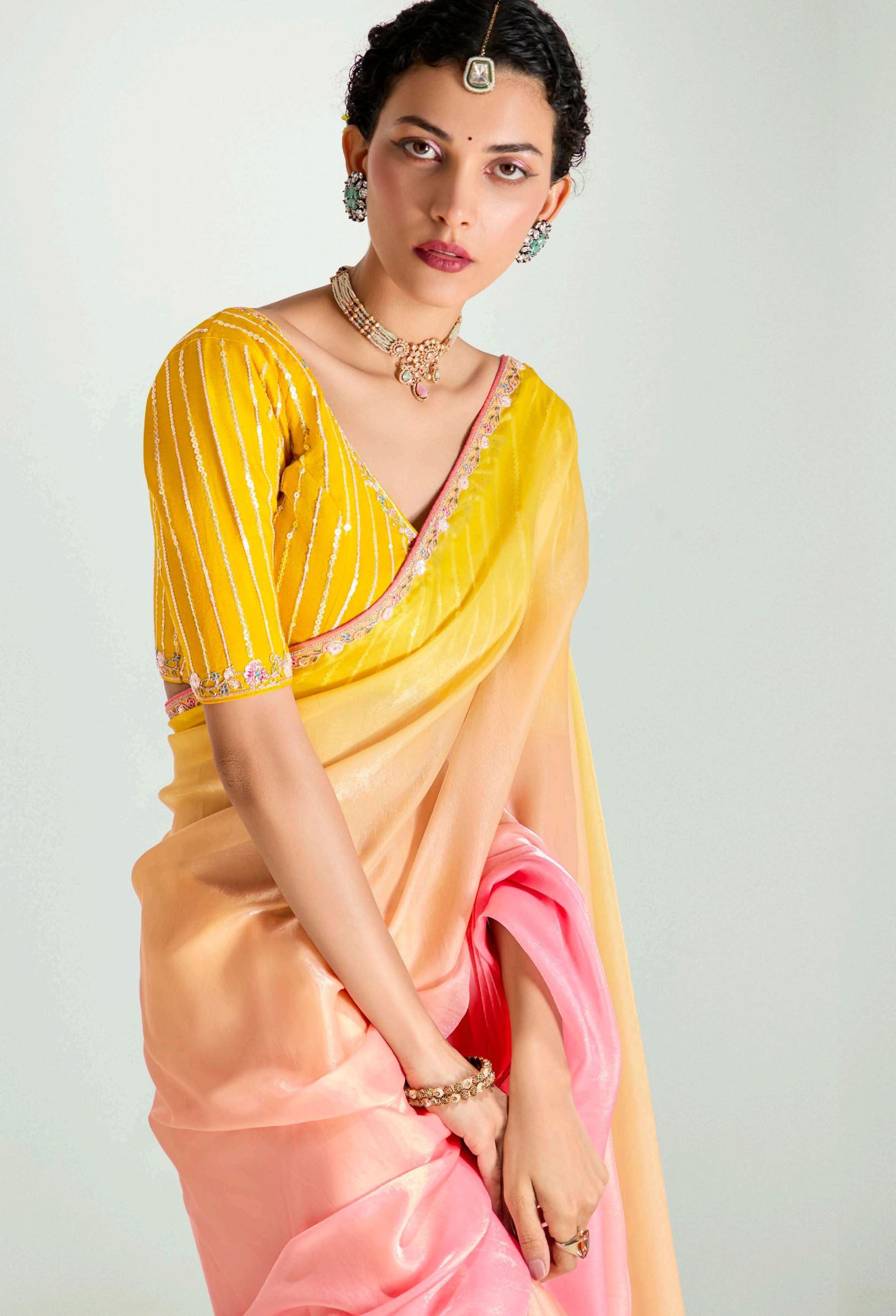 Multicolor Organza Tissue Saree With Border Work and Embroidered Blouse