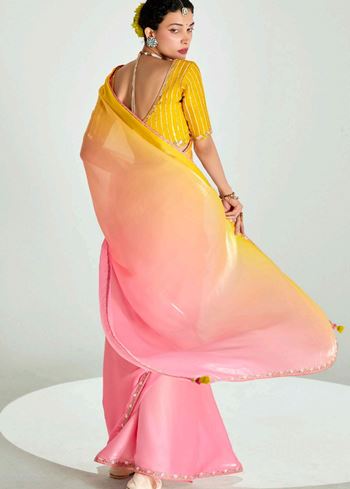 The saree features intricate heavy work on the border, lending it richness and definition without overshadowing the natural fluidity of the fabric. The color transitions throughout the drape offer a dynamic yet balanced appeal, making it a versatile addition to any ethnic wardrobe.