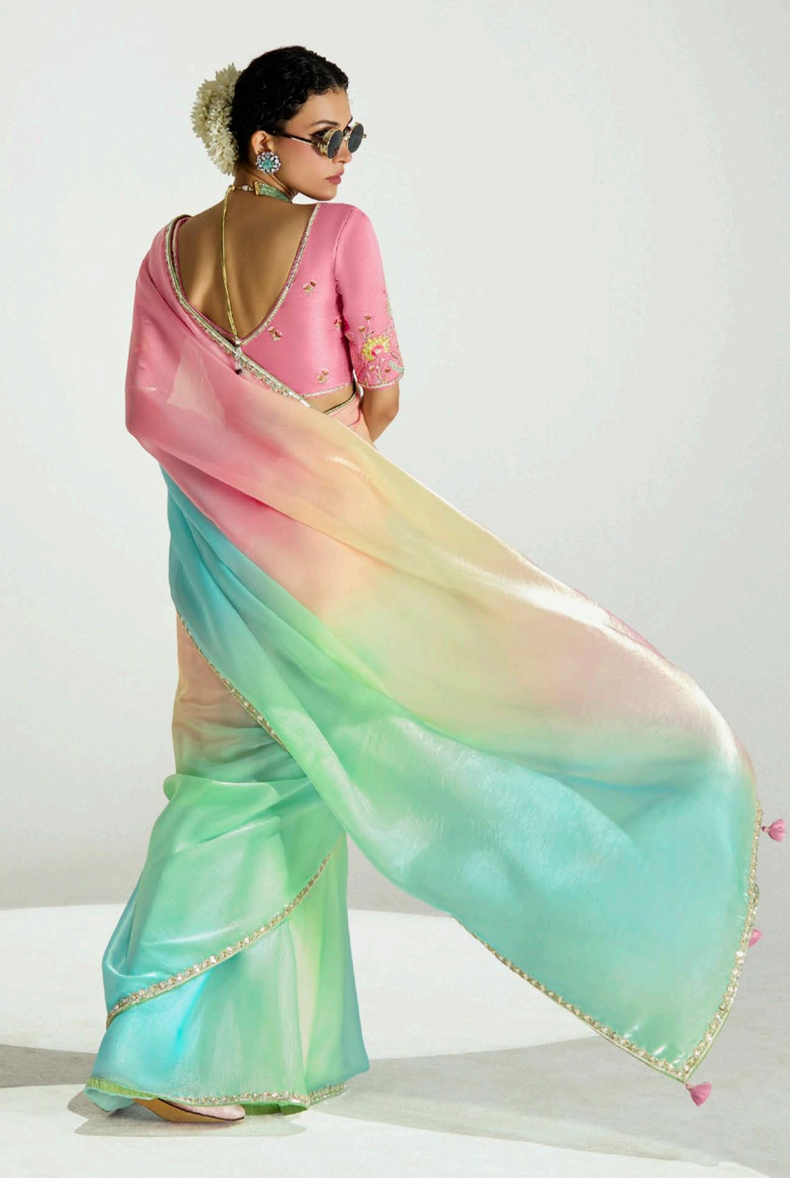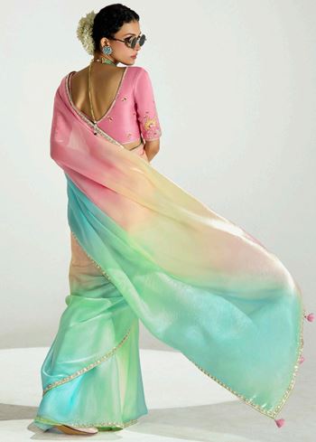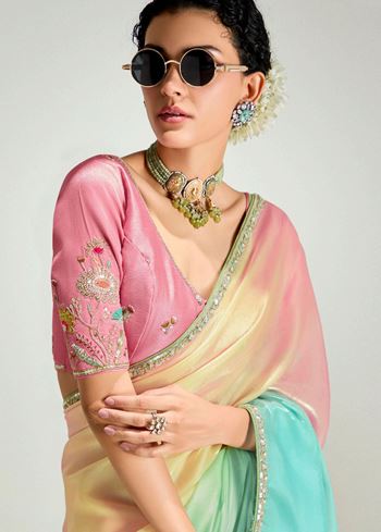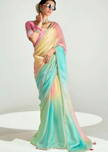 Multicolor Organza Tissue Saree With Border Work and Embroidered Blouse