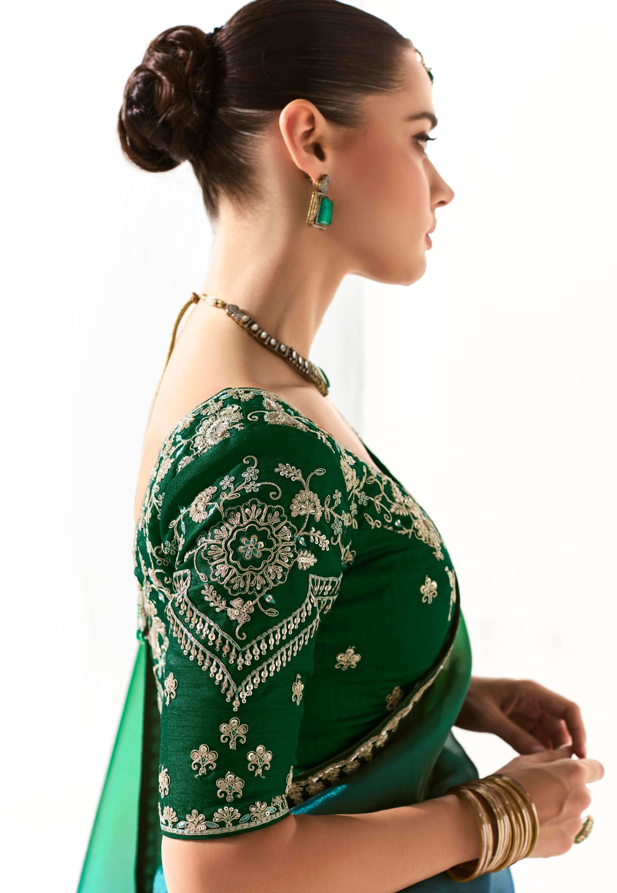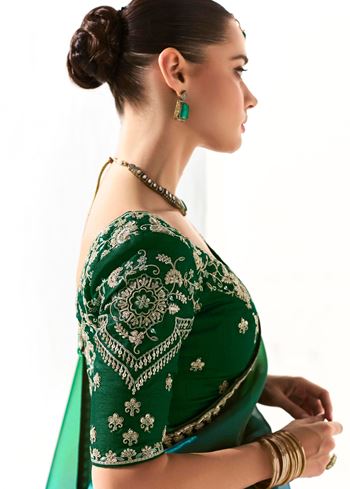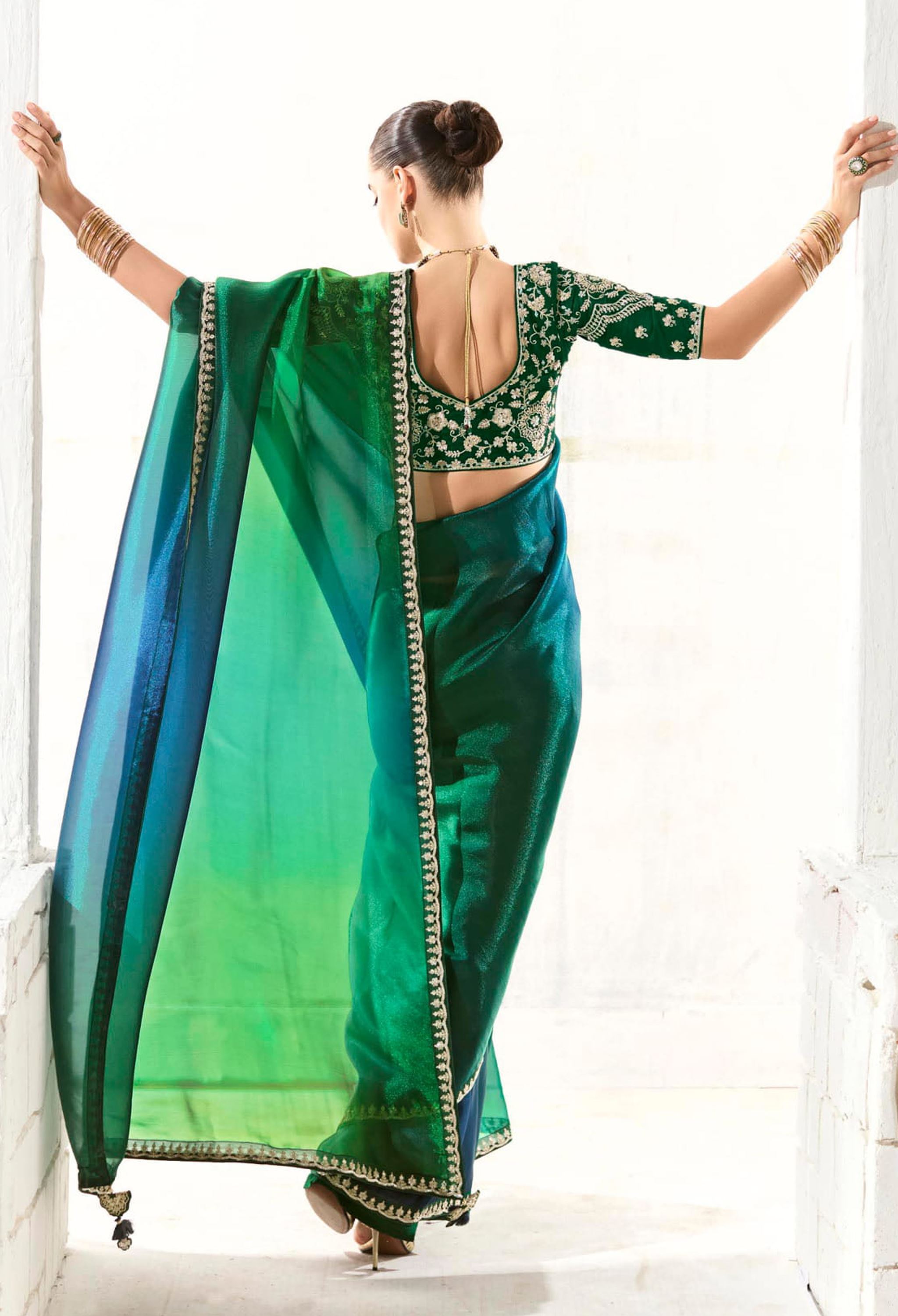 Paired with a green organza tissue blouse, beautifully embroidered to complement the saree’s intricate border, this ensemble strikes a perfect balance between tradition and modernity. The vibrant green blouse adds a refreshing contrast, making the outfit stand out effortlessly.