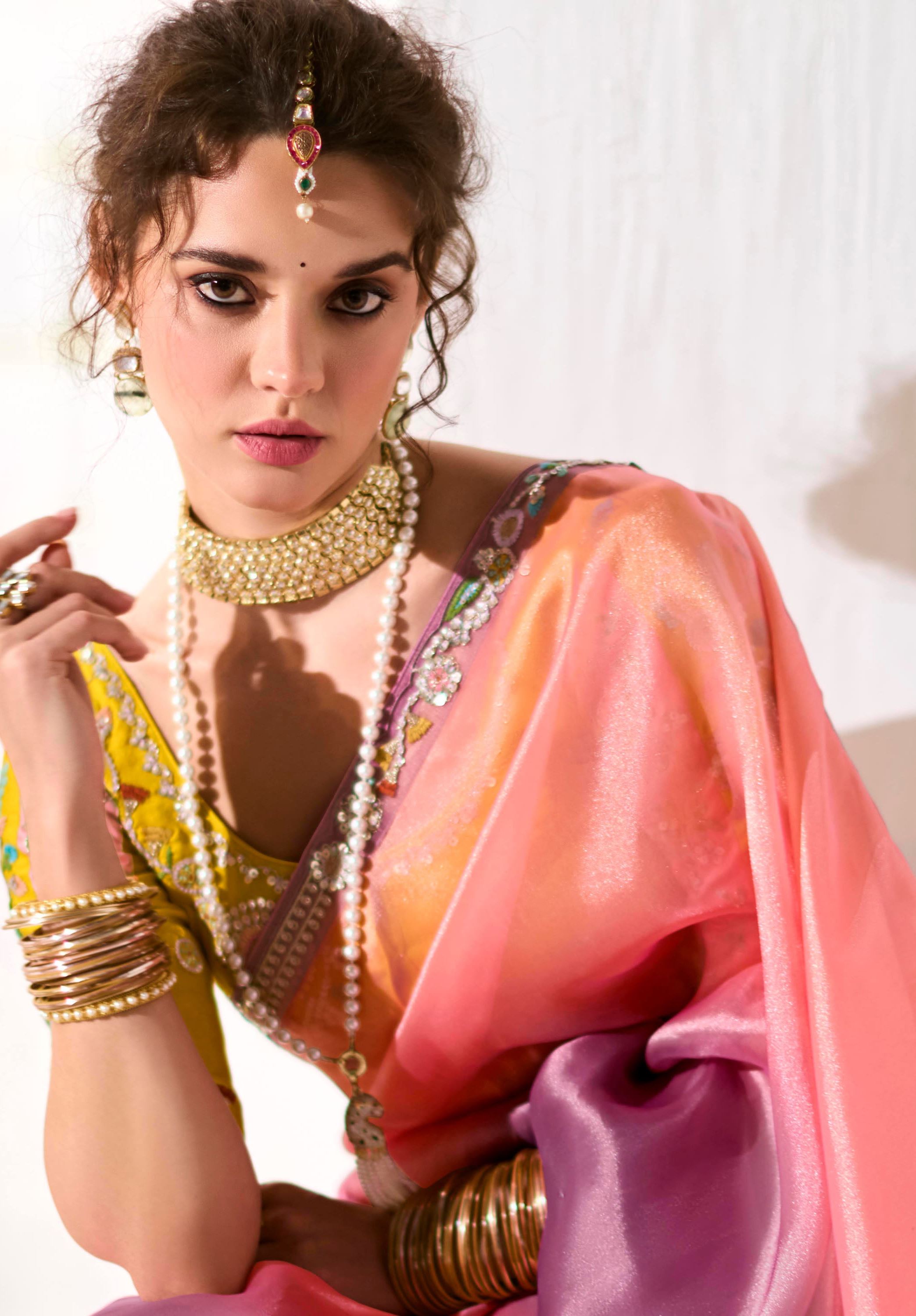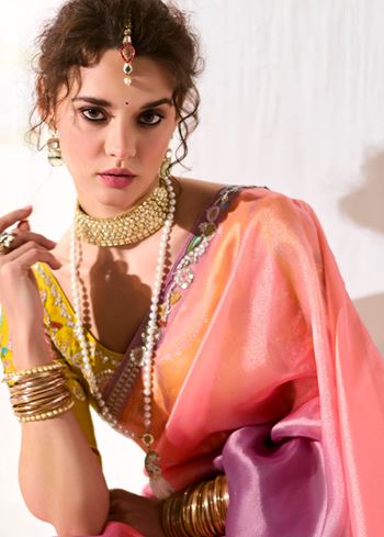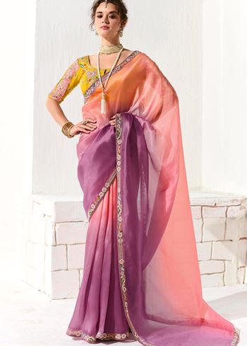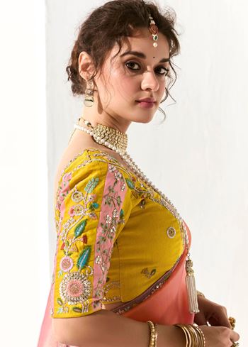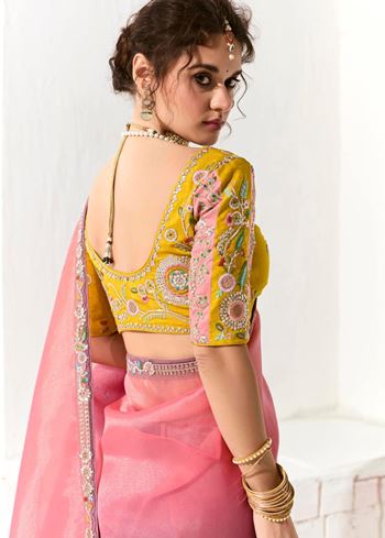 The saree pairs exquisitely with a bright yellow organza tissue blouse, beautifully embroidered to complement the saree’s detailed border. This combination creates a vivid contrast that enhances the overall ensemble, ideal for festive occasions, weddings, or parties where you want to stand out with style and grace.