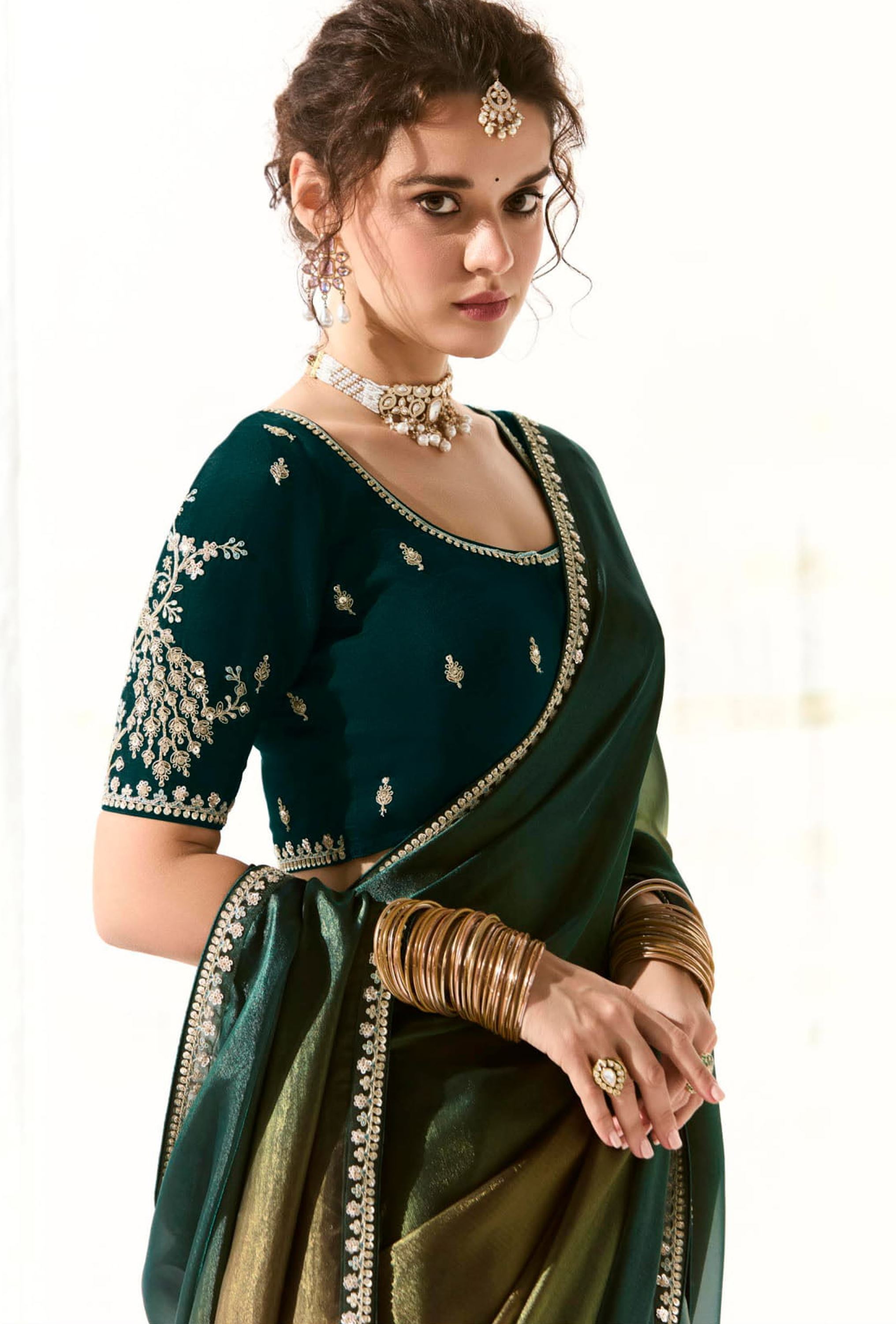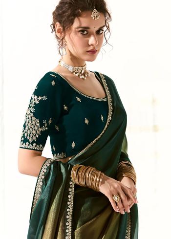 Paired with a dark green organza tissue blouse, richly embroidered to match the saree’s intricate border, this ensemble creates a striking and harmonious contrast. Ideal for weddings, celebrations, or festive gatherings, it blends traditional artistry with modern style seamlessly.