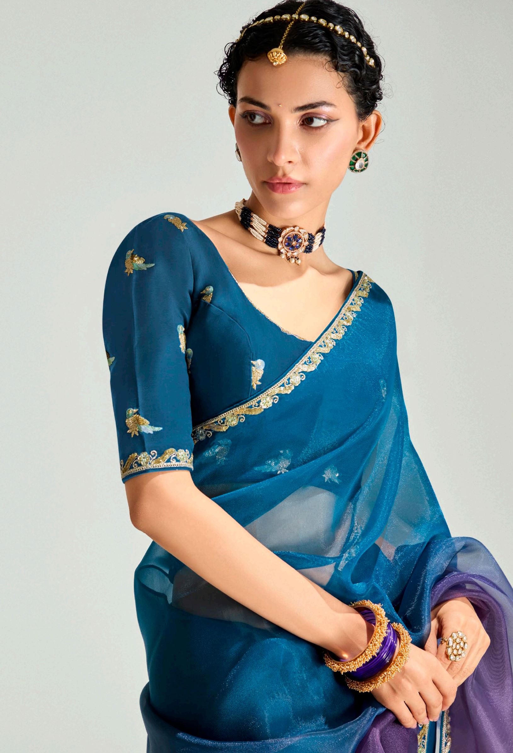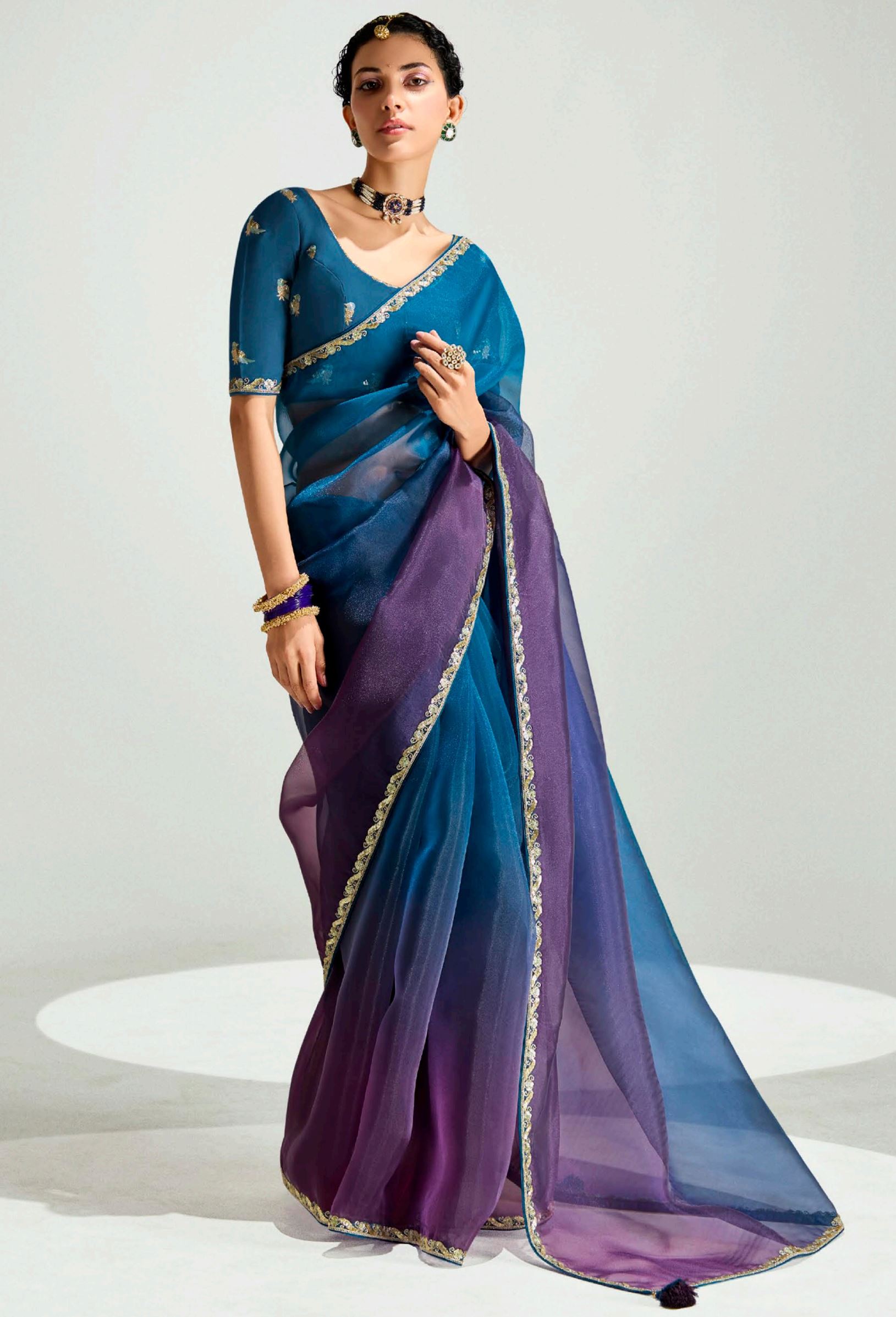 Multicolor Organza Tissue Saree With Border Work and Heavy Embroidery Work Blouse