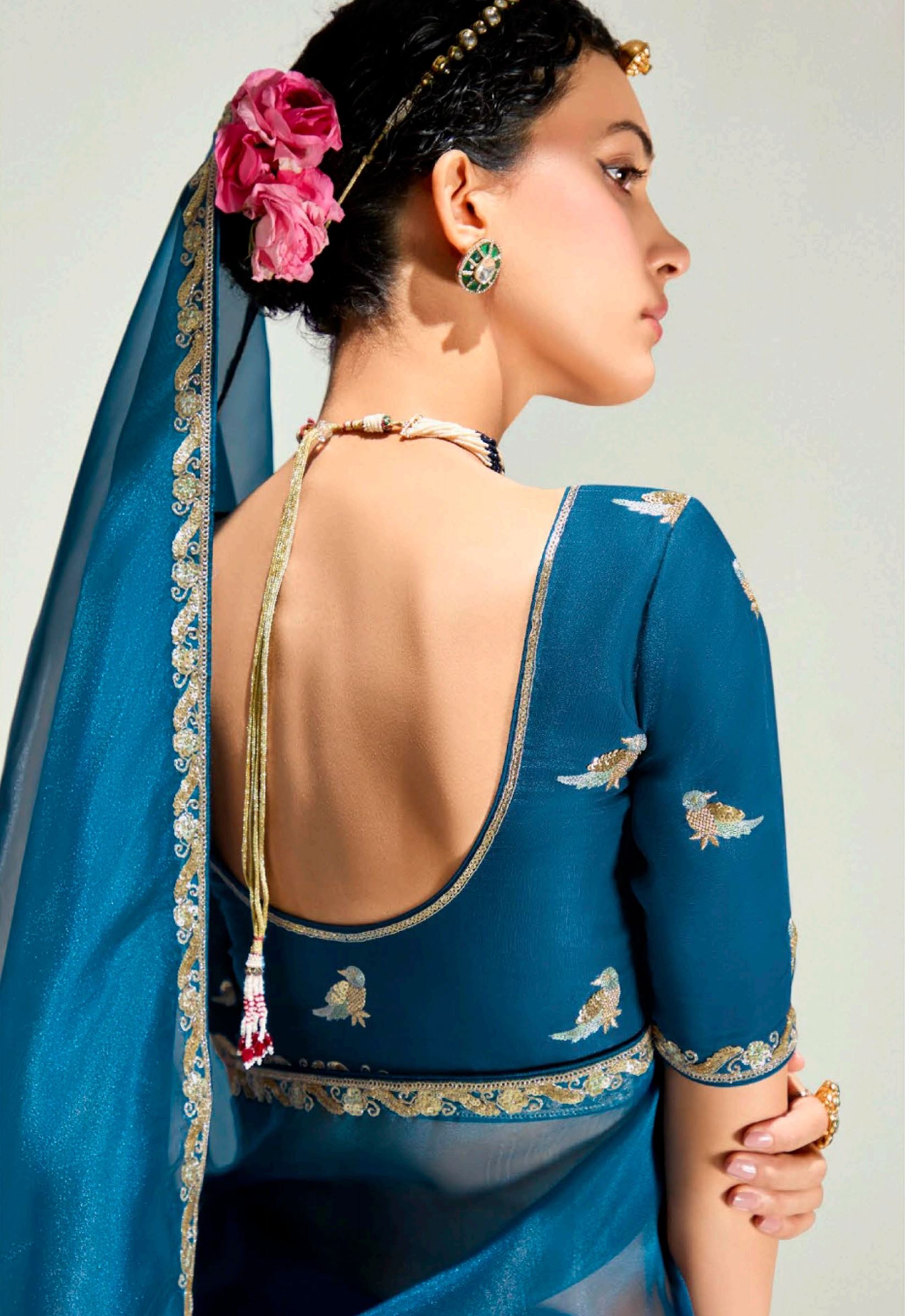 The set comes with a blue art silk blouse, designed with heavy embroidery work that complements the saree’s artistic finesse. The blouse offers both comfort and couture appeal, making it the perfect addition to this grand ensemble.
