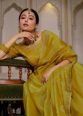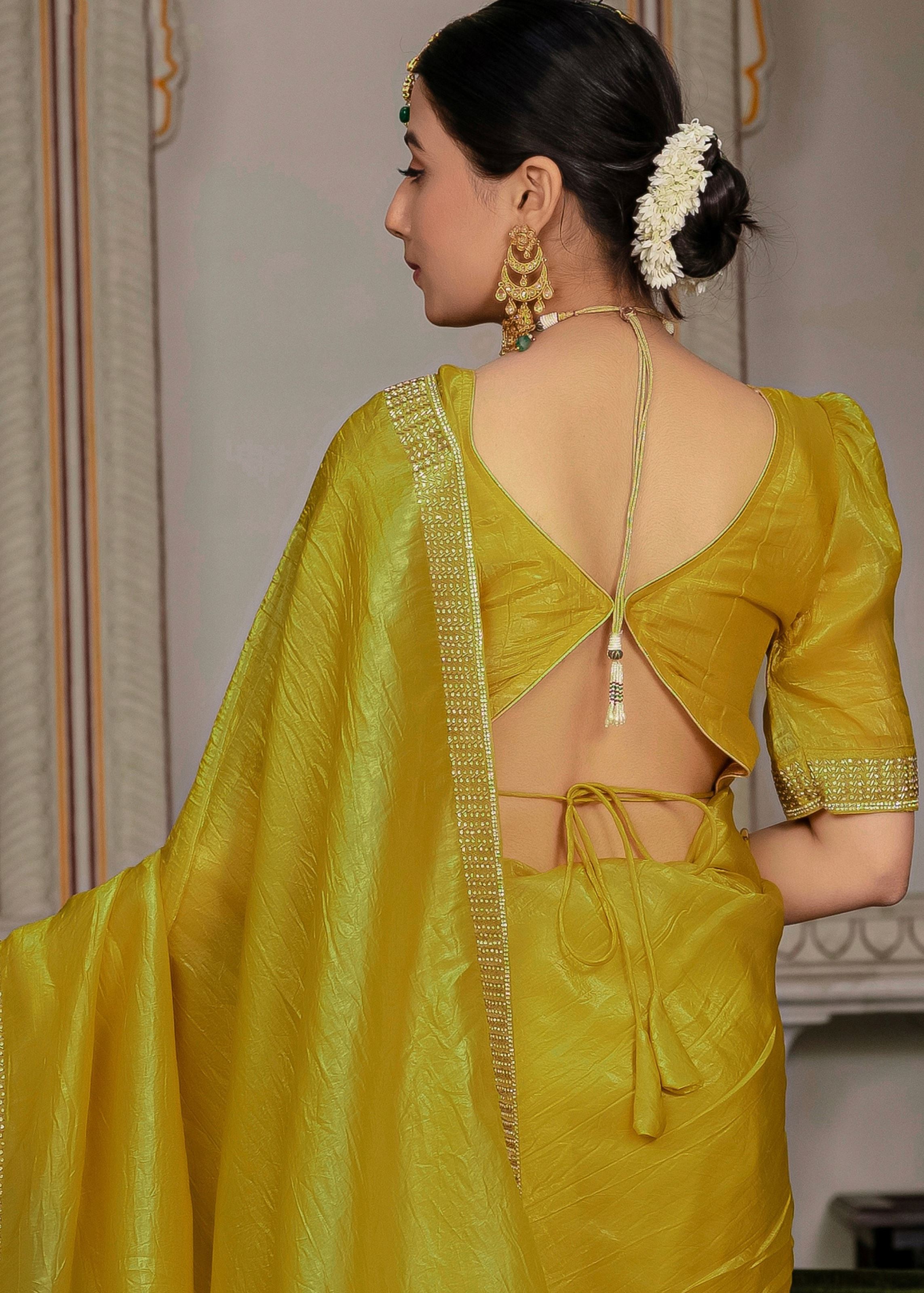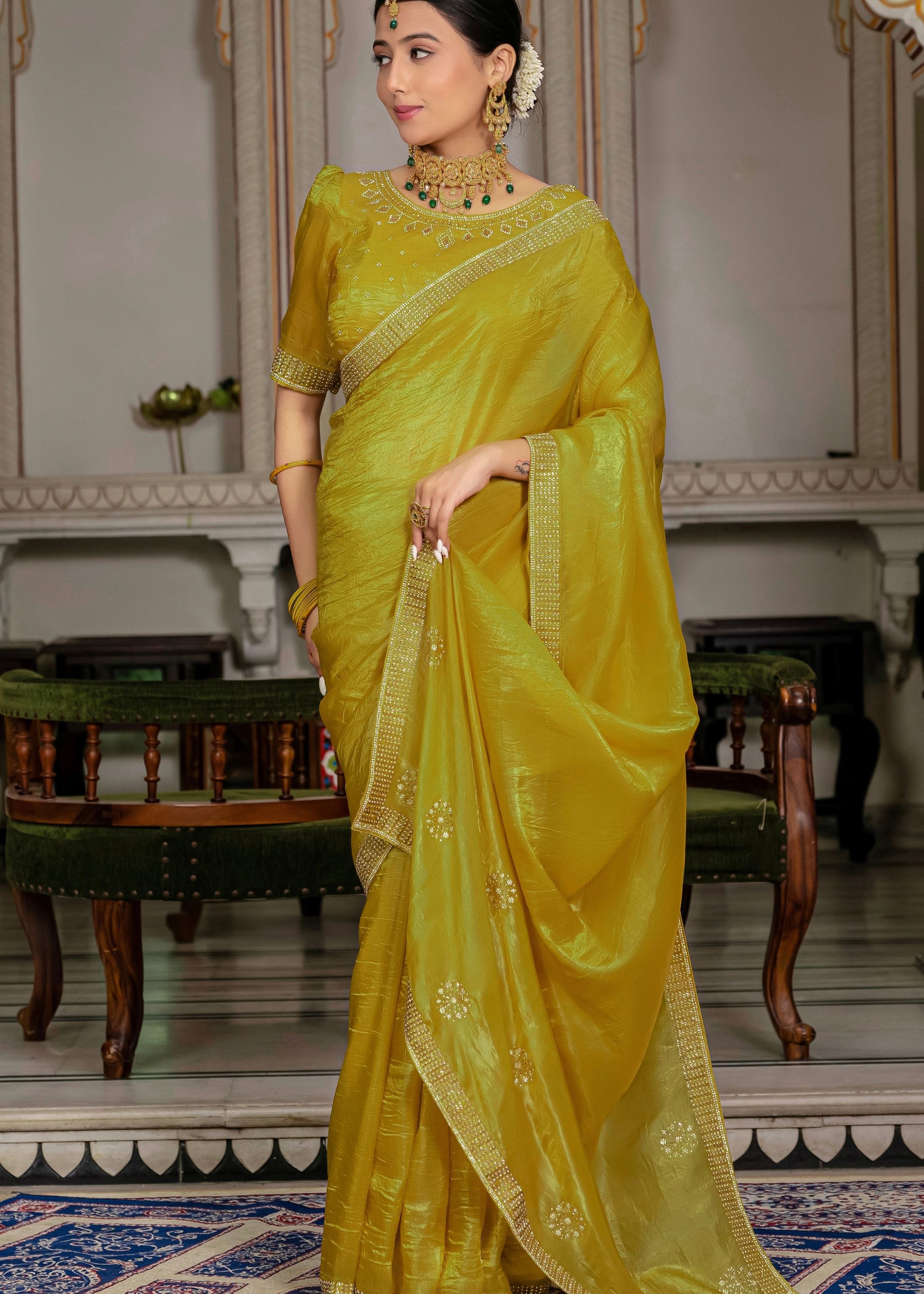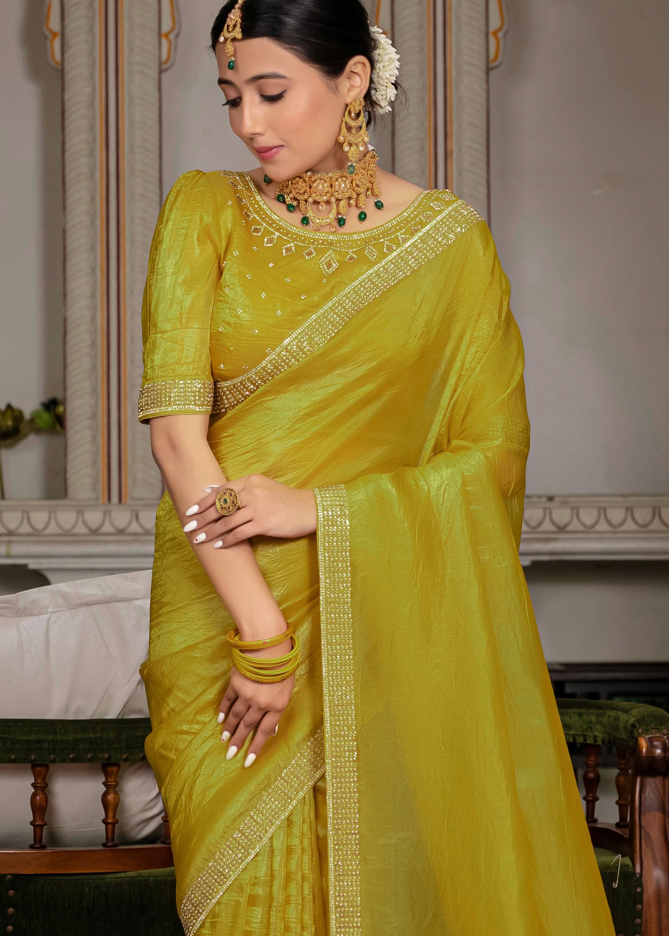 Mustard Color Gold Crush Saree with Cutdana and Zarkan Work