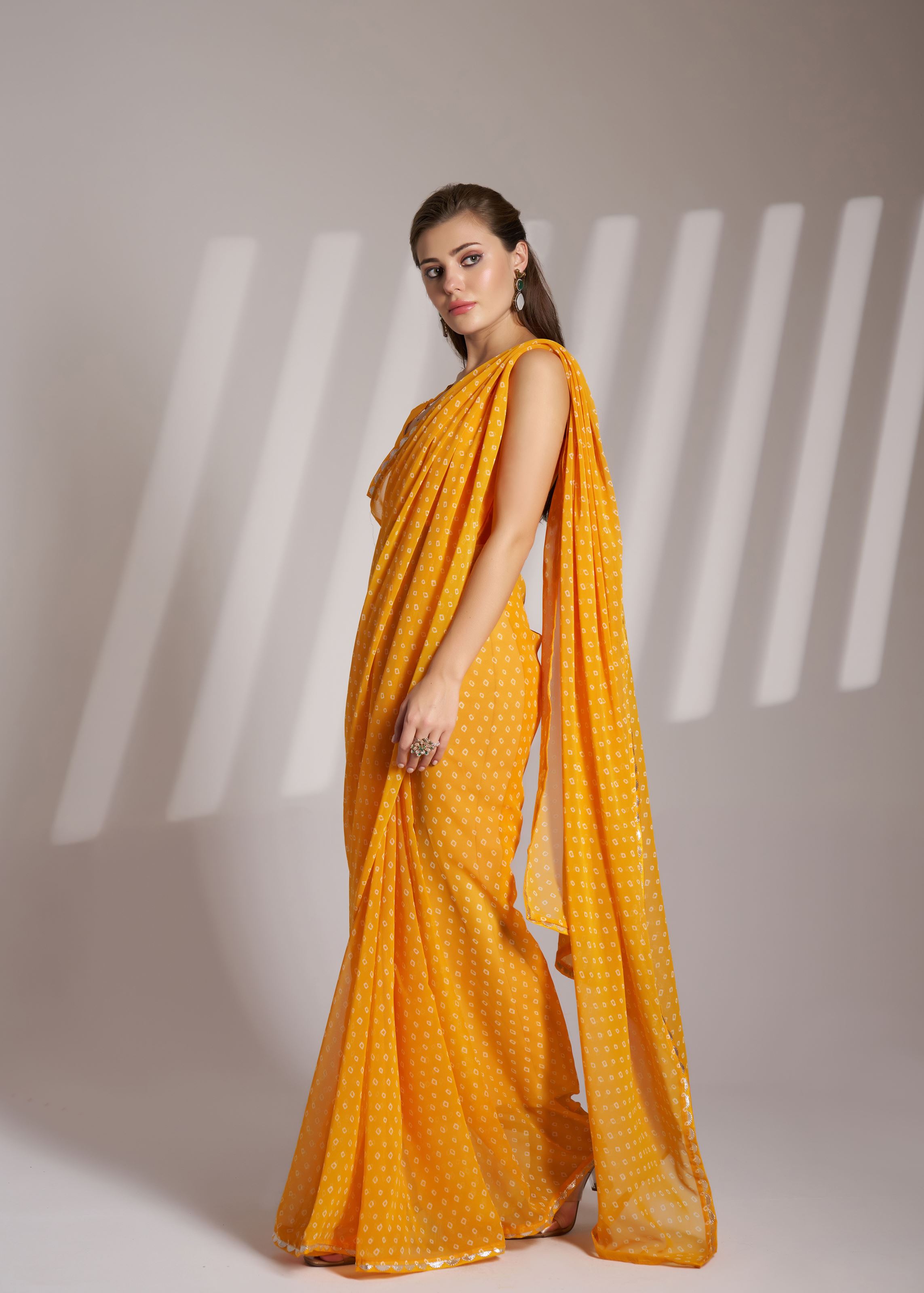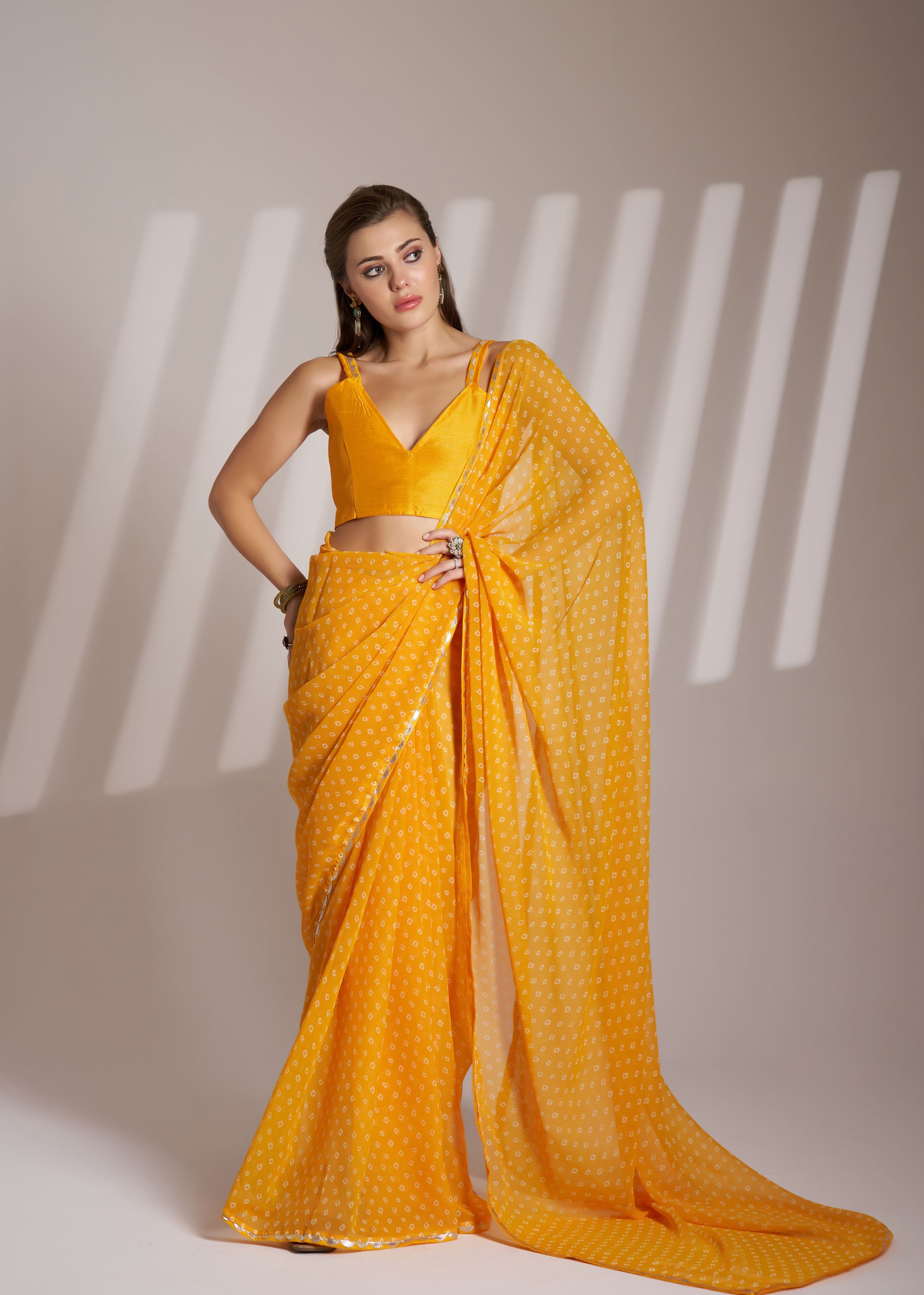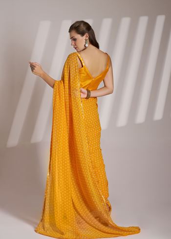 Perfect for women who love striking yet classy fashion, this saree can be styled with statement earrings, bangles, and embellished footwear for a dazzling finish. Carry it with a clutch or potli bag to complete your partywear look.Bring home this mustard Bollywood-style georgette saree and redefine your wardrobe with grace, charm, and effortless glamour.