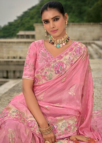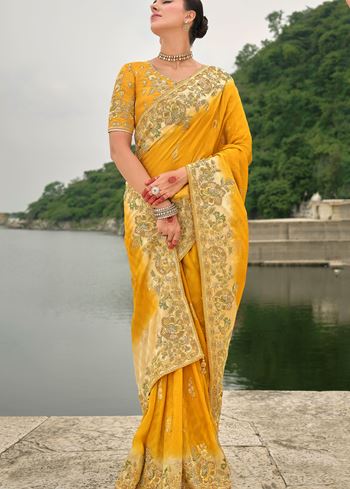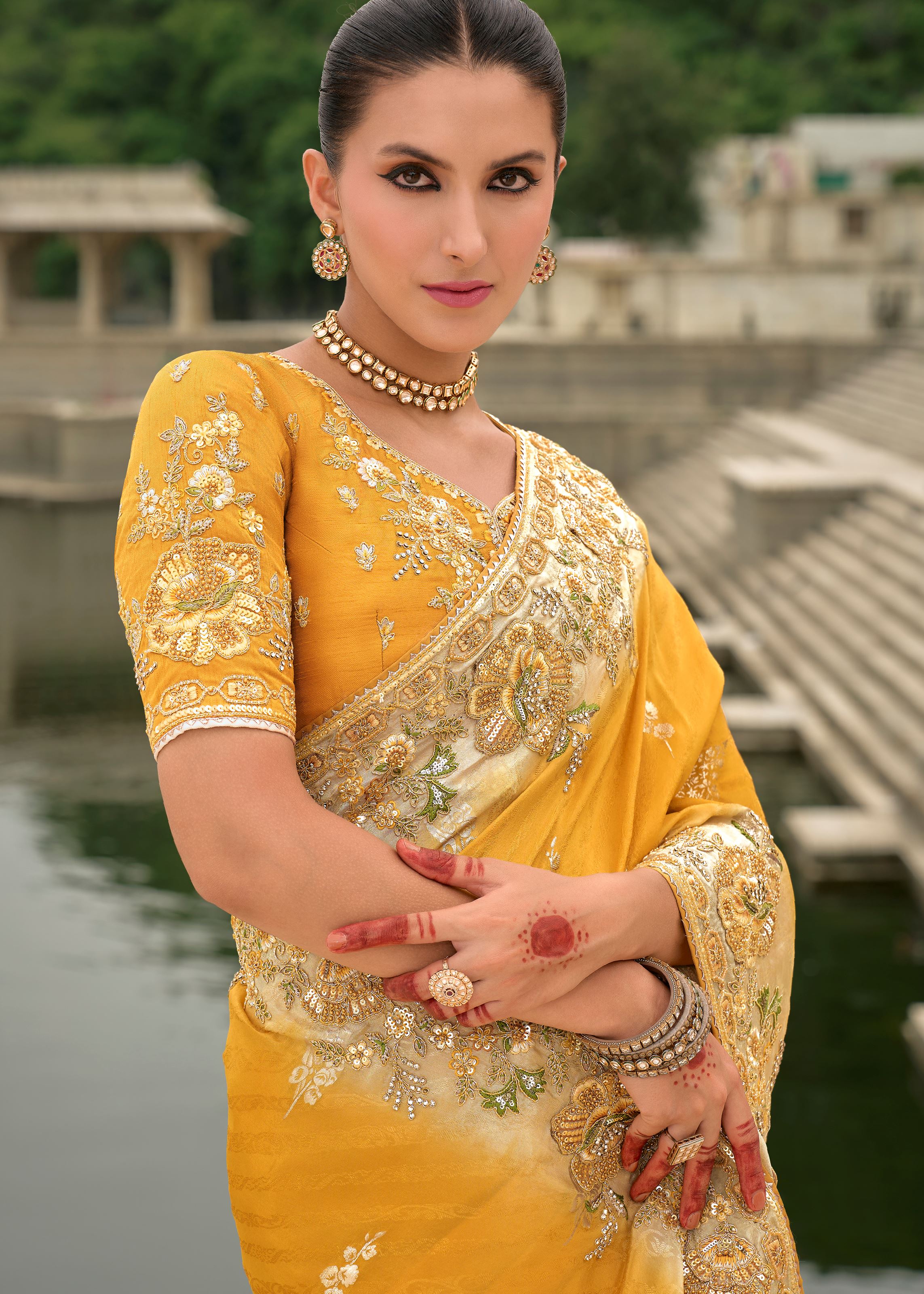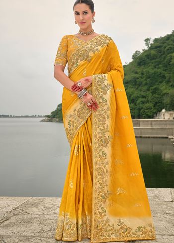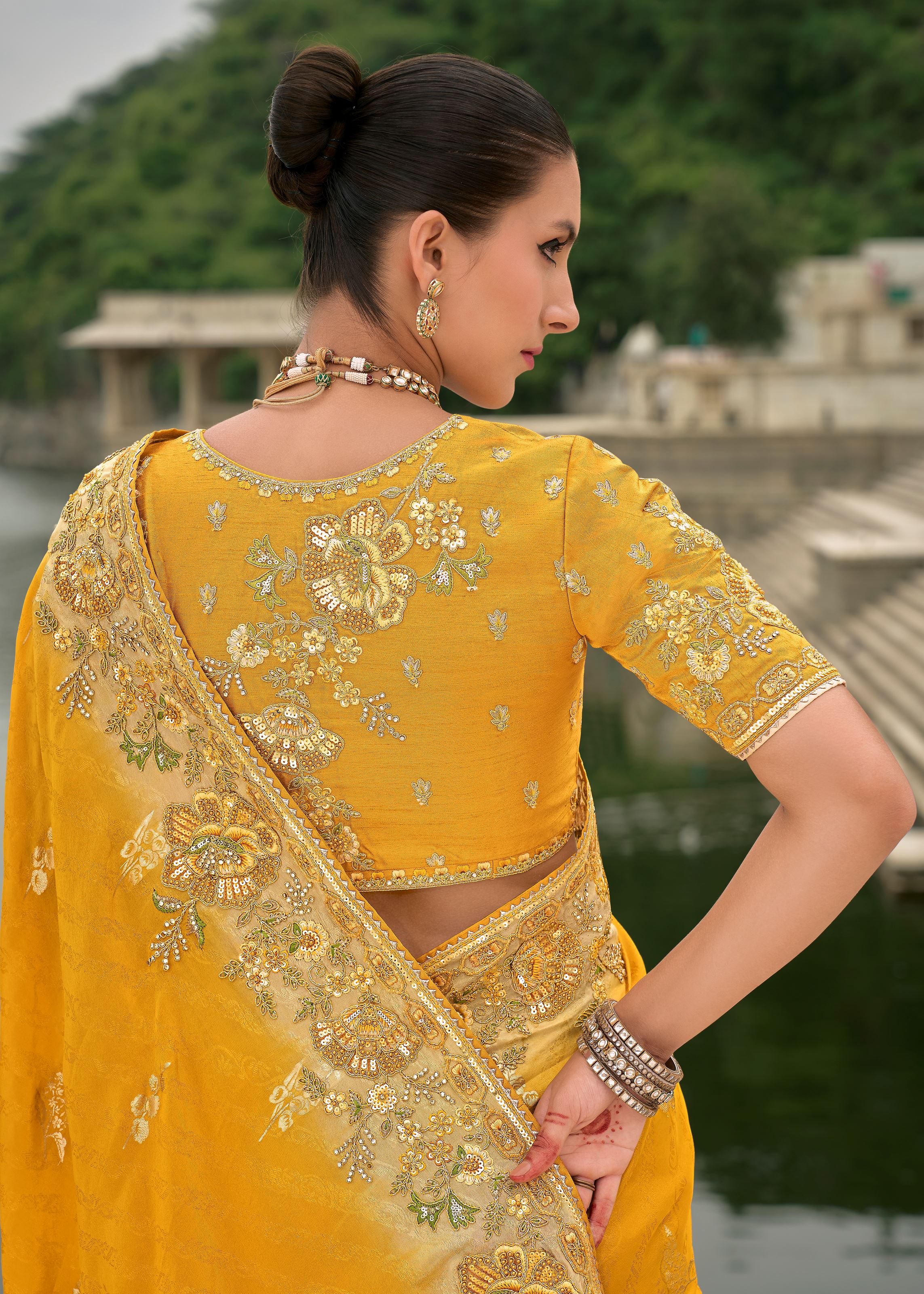 Mustard Jacquard Saree With Heavy Thread Embroidery and Sequins Work