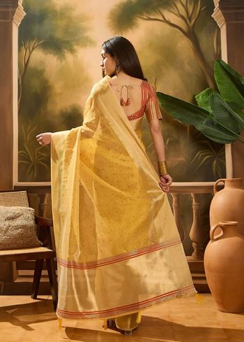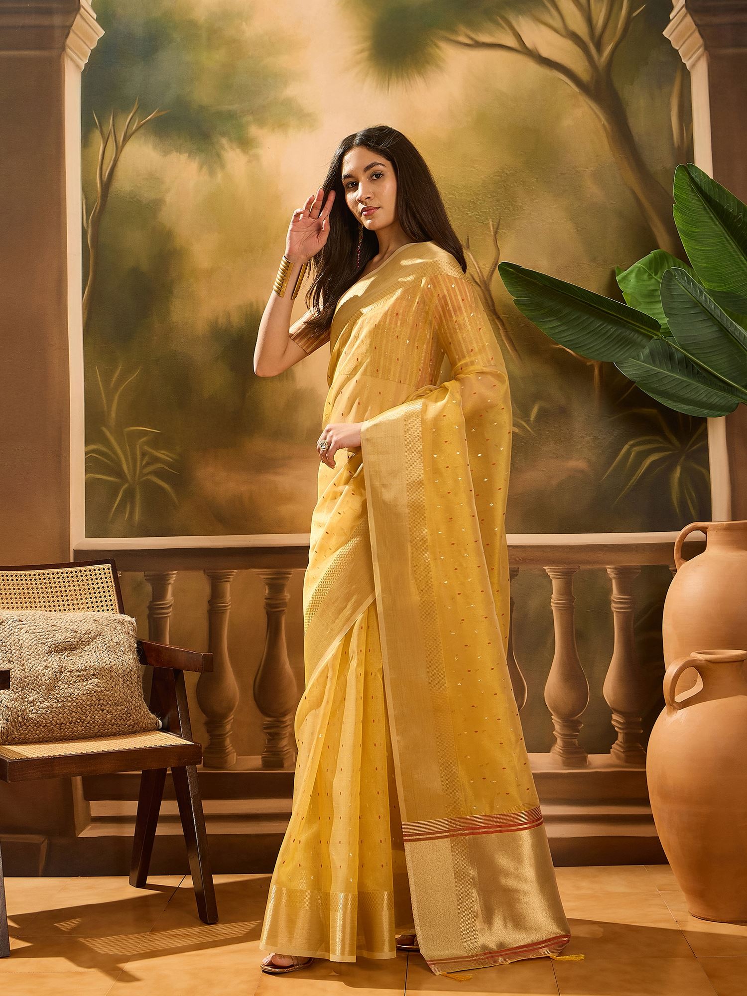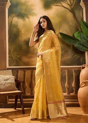 Mustard Khadi Organza Woven Jacquard Designer Ethnic Partywear Saree