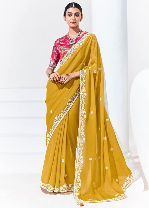 Mustard Organza Saree With Thread Embroidery with Printed Blouse