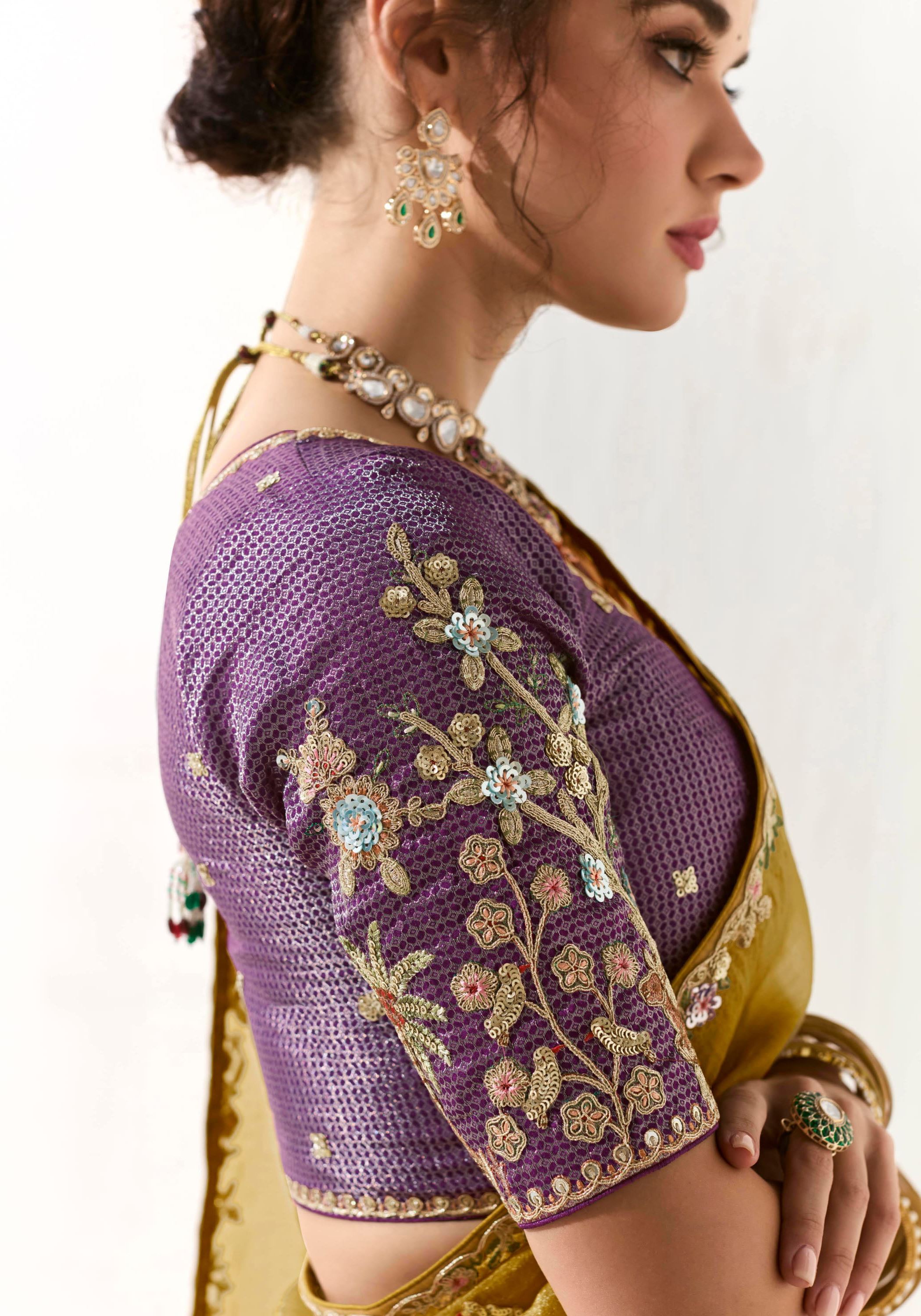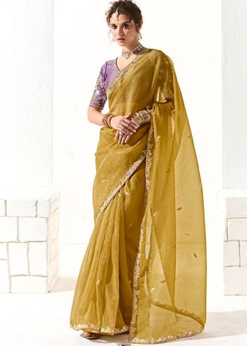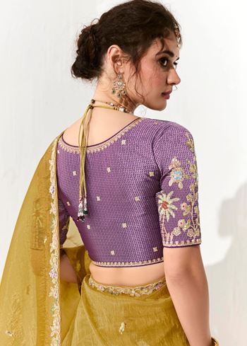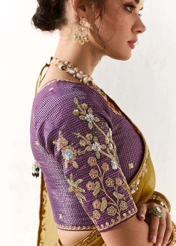 The ensemble is paired with a contrasting violet organza tissue blouse, beautifully embroidered to complement the saree’s rich border work. This blend of mustard and violet creates a striking visual harmony, perfect for women seeking designer sarees online that balance tradition with contemporary style.