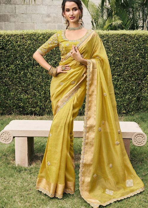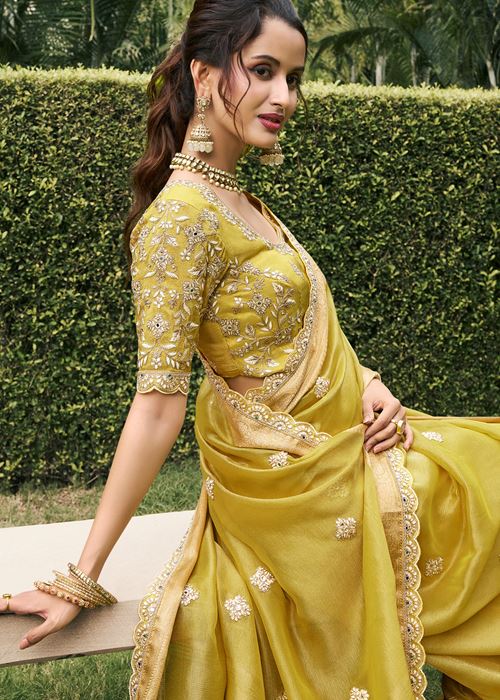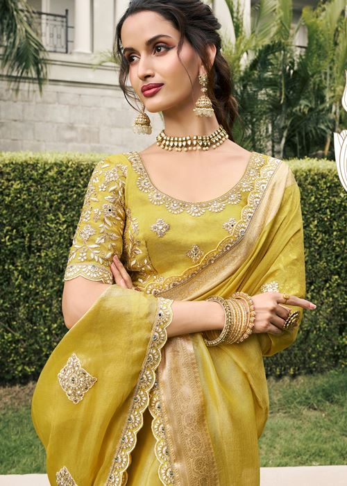 Mustard Saree With Heavy Thread Embroidery, Stone, Pearl, Real Mirror Work