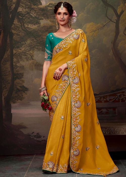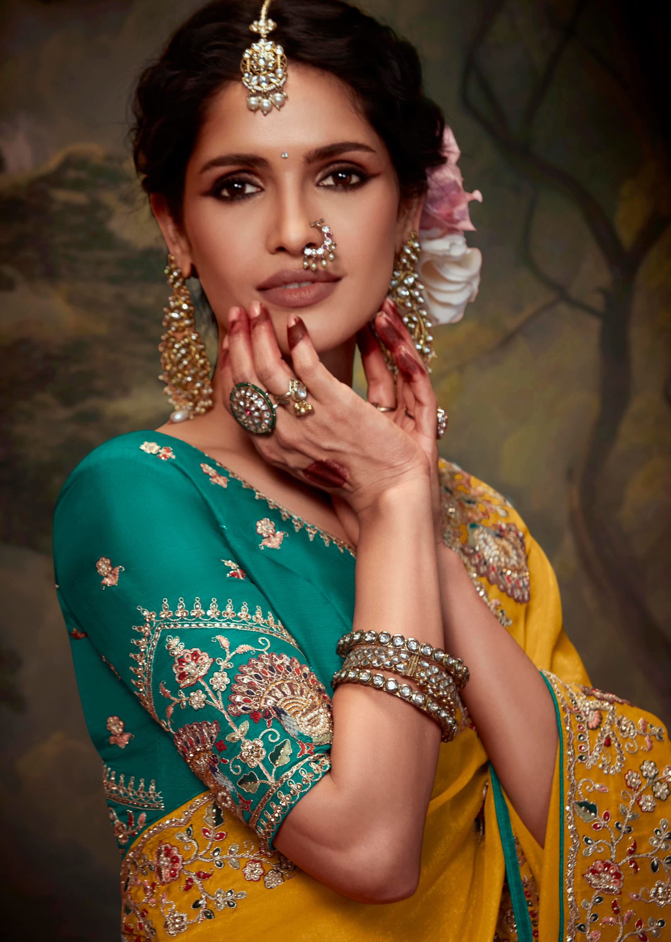 Mustard Saree with Heavy Thread Embroidery Sequins Work and Embroidery Blouse