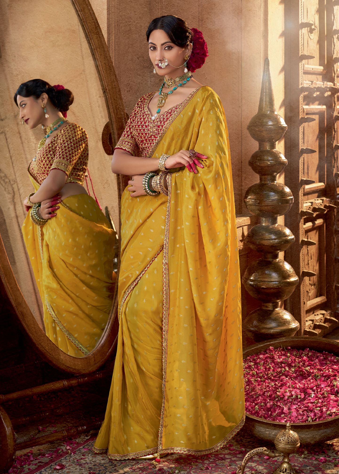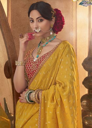 The rich mustard hue exudes warmth and vibrancy, while the contrasting red pure viscose crepe blouse is adorned with intricate embroidery, creating a striking visual balance. Designed for comfort and sophistication, this saree is lightweight yet opulent, making it ideal for long festive hours or special evening occasions.
