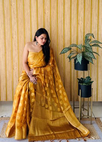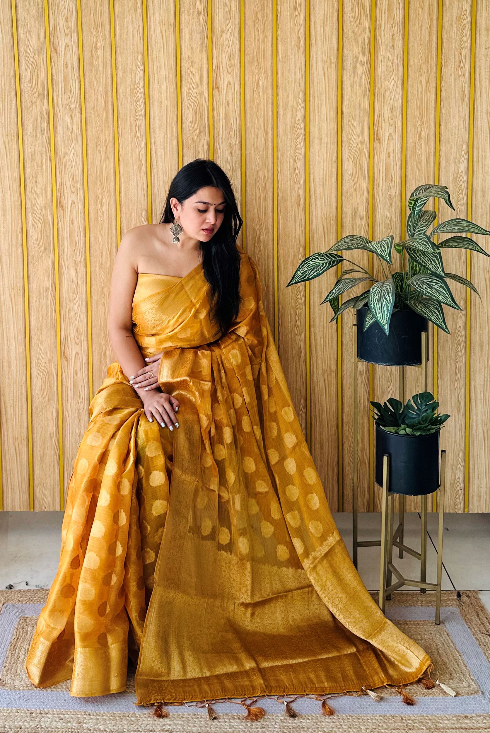 Mustard Woven Jari Designer Gimichu Silk Partywear Saree