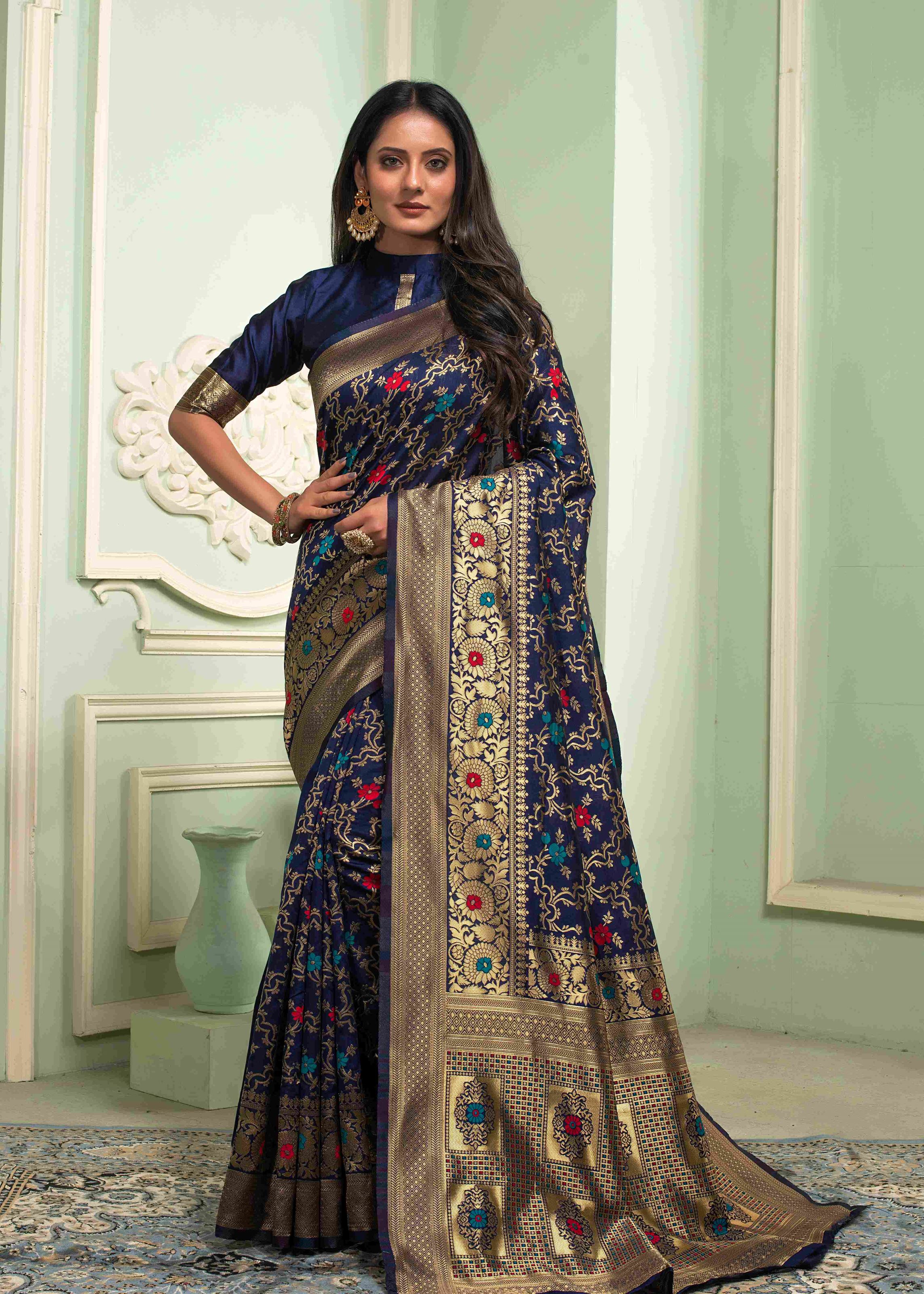 Navy Blue Banarasi Silk Saree with Jacquard Woven Work