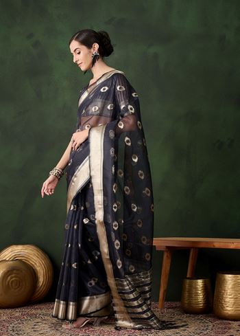 Navy Blue Khadi Organza Woven Jacquard Designer Graceful Traditional Saree