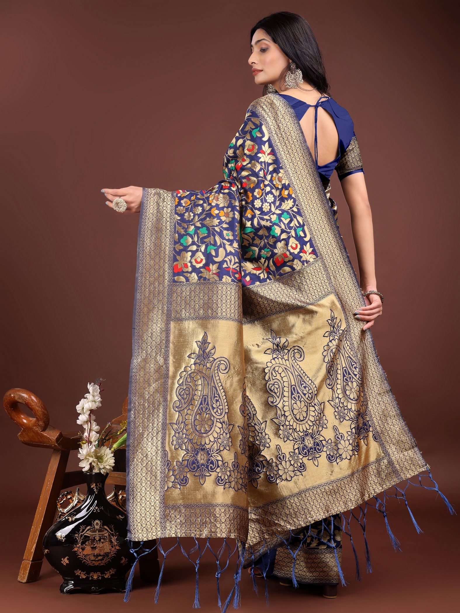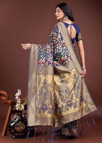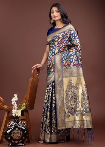 The navy blue color symbolizes sophistication and grace, making it ideal for evening celebrations, weddings, and cultural gatherings. The intricate woven patterns elevate the overall charm, creating a design that is both classic and fashionable. Whether paired with statement jewelry or minimal accessories, this saree effortlessly enhances your natural elegance.