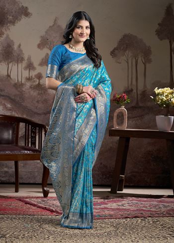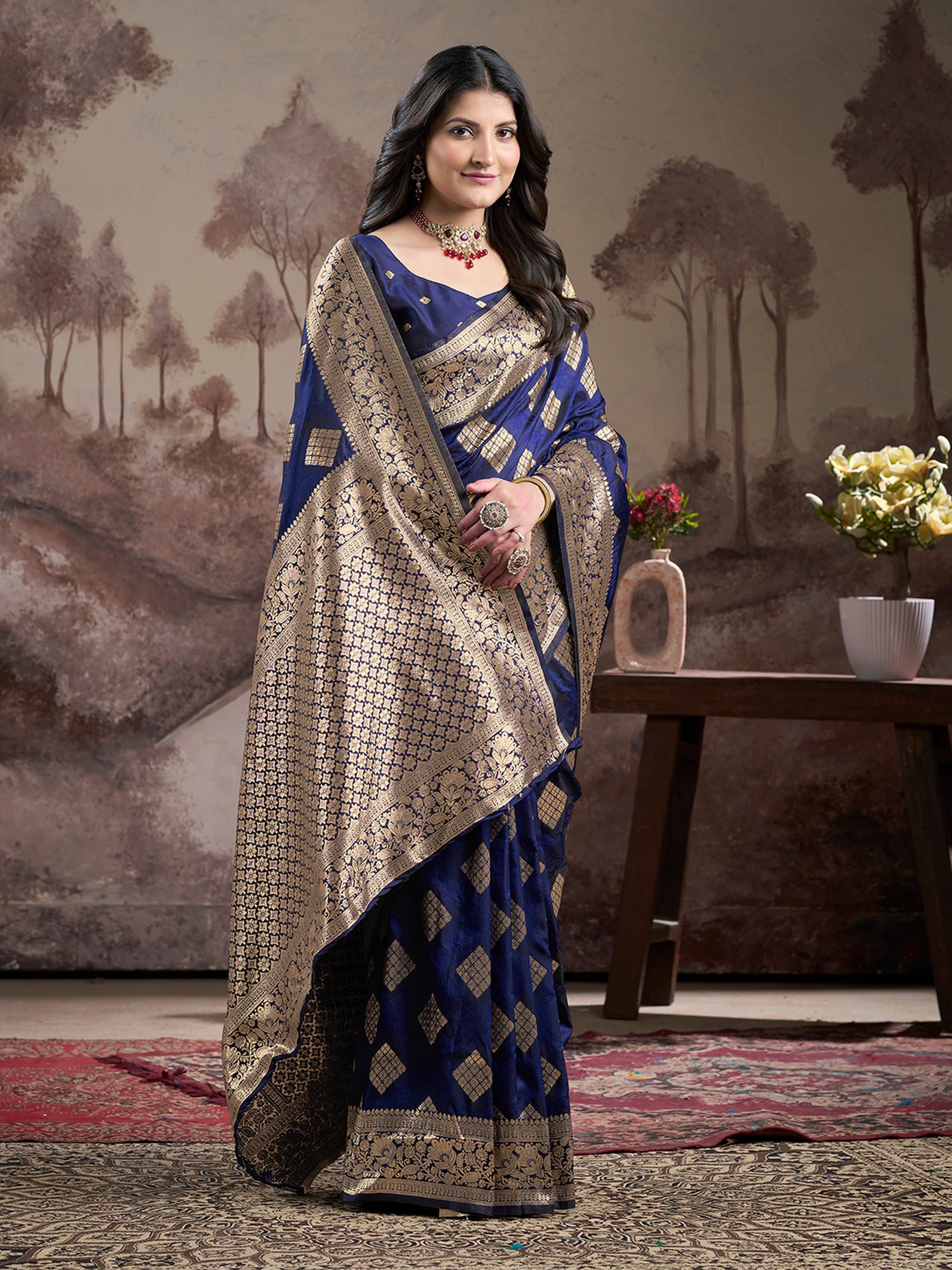 Paired with a matching navy blue art silk blouse, the ensemble creates a cohesive and graceful look. The detailed woven motifs and rich pallu highlight exceptional artistry, merging traditional techniques with modern fashion appeal. Lightweight yet opulent, this saree ensures comfort while allowing you to stand out at every ceremonial or social gathering.