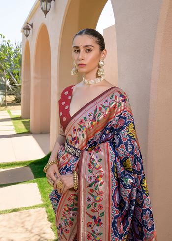 Step into the spotlight with the timeless charm of this Navy Blue Paithani Silk Saree, a masterpiece that encapsulates the rich legacy of Indian handloom artistry. Woven from premium Paithani silk, this saree boasts a deep navy blue hue that exudes elegance and sophistication.