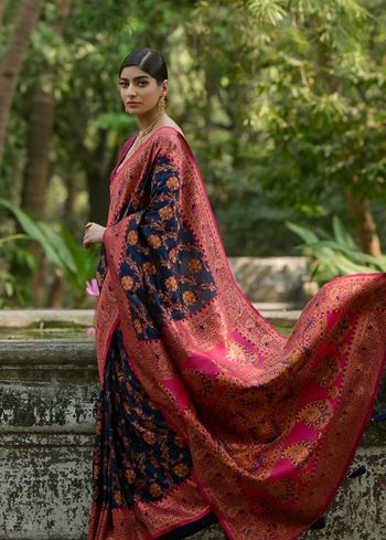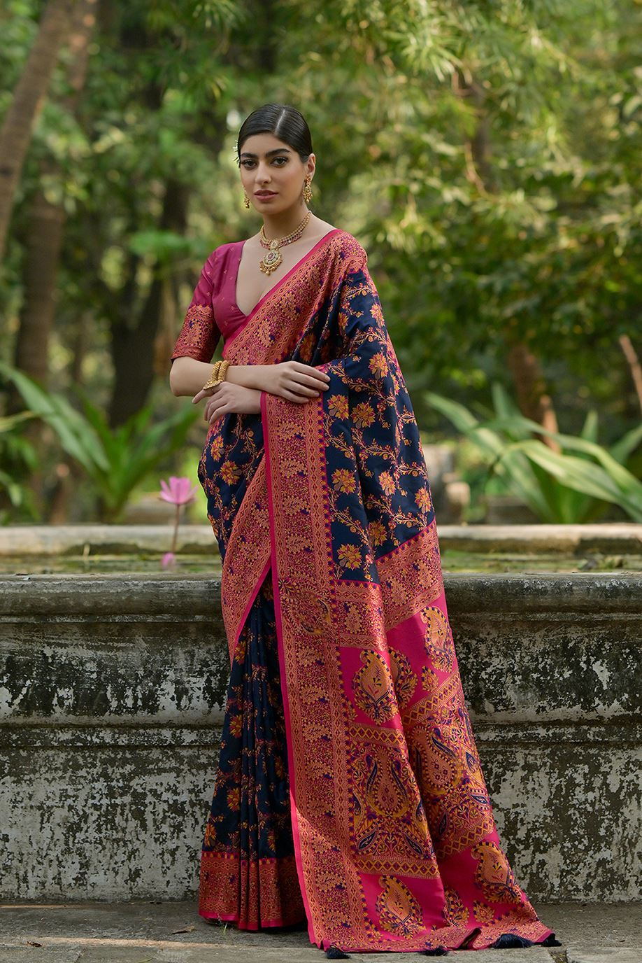 Navy Blue Pashmina Silk Saree with Floral Jal and Thread Pallu