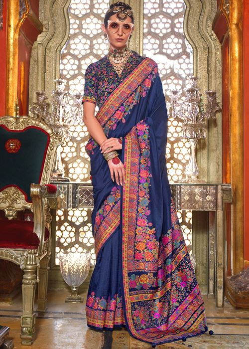 Navy Blue Silk Saree With Floral Print