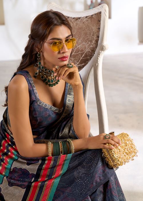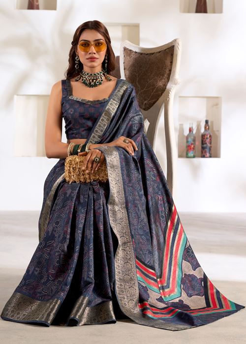 Navy Blue Soft Dola Silk Saree With Foil Print With Jacquard Woven Work