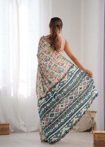Off White Beautiful Chinon Fabric Digital Printed Saree With Mirror Cut Work