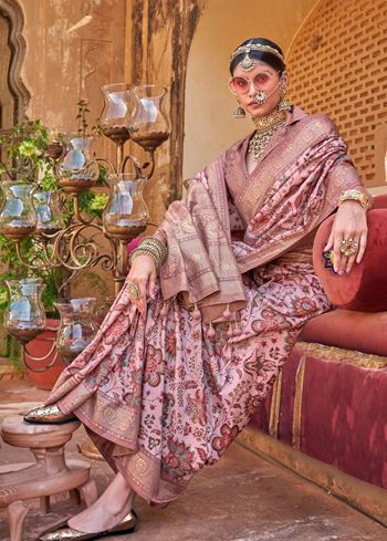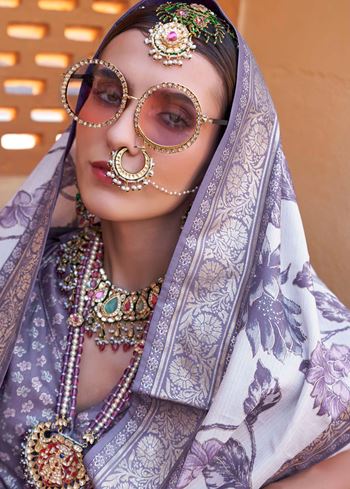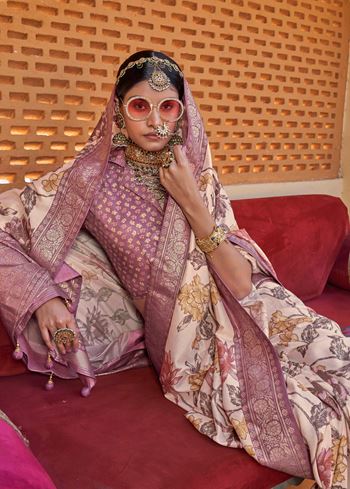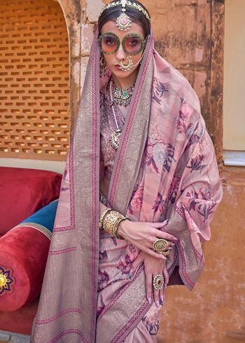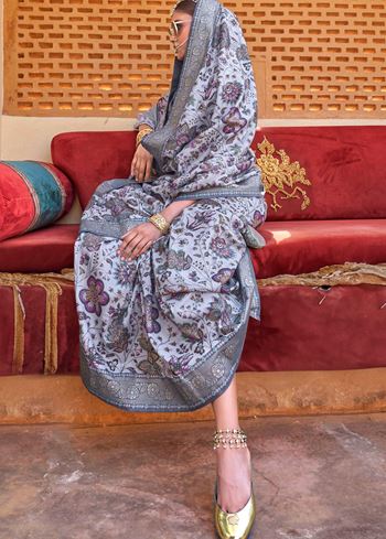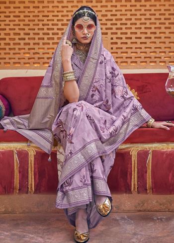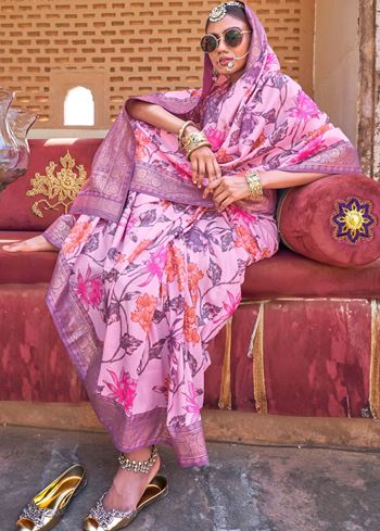 This saree comes with a contrasting dusty purple PV silk blouse, adding depth and balance to the ensemble. The floral prints are tastefully placed, making it easy to style for both minimal and statement looks. Whether worn with delicate earrings or bold accessories, this saree offers versatility and elegance in equal measure.