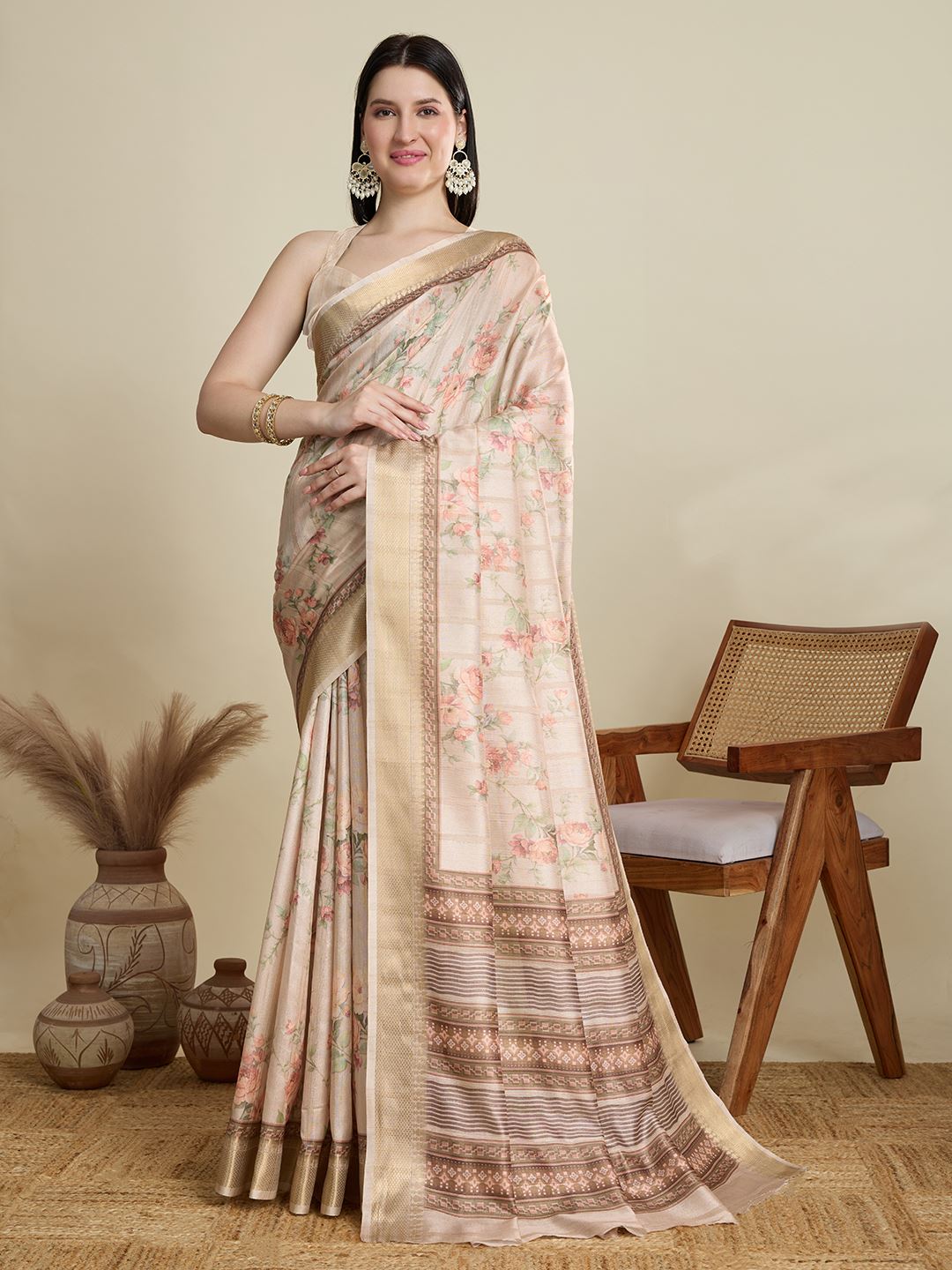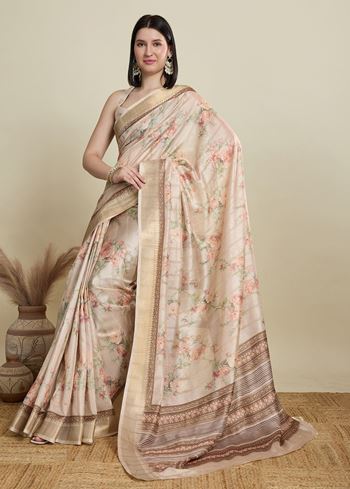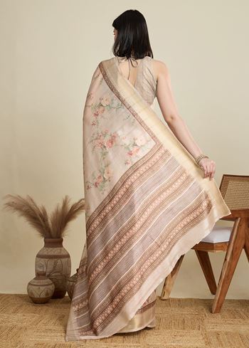 The printed details bring an extra element of charm, complementing the minimal yet stylish design. It comes with a matching blended cotton blouse piece in off white, allowing you to create a well-coordinated ensemble for any special occasion. Lightweight and easy to drape, this saree promises a graceful fall and all-day comfort.