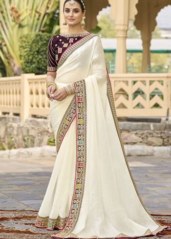 Off White Georgette Plain Saree With Embroidered Lace Border