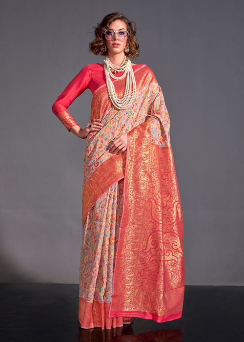 Off White Kashmiri Silk Saree With Kashmiri Chaap Jacquard Woven Work