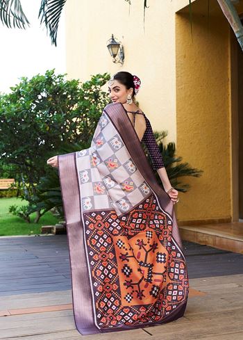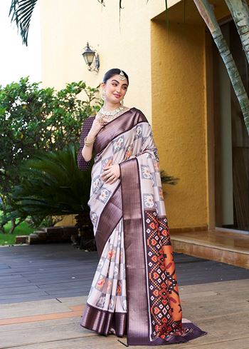 Off White Trendy Crepe Saree With Woven Zari Patta And Designer Print Work