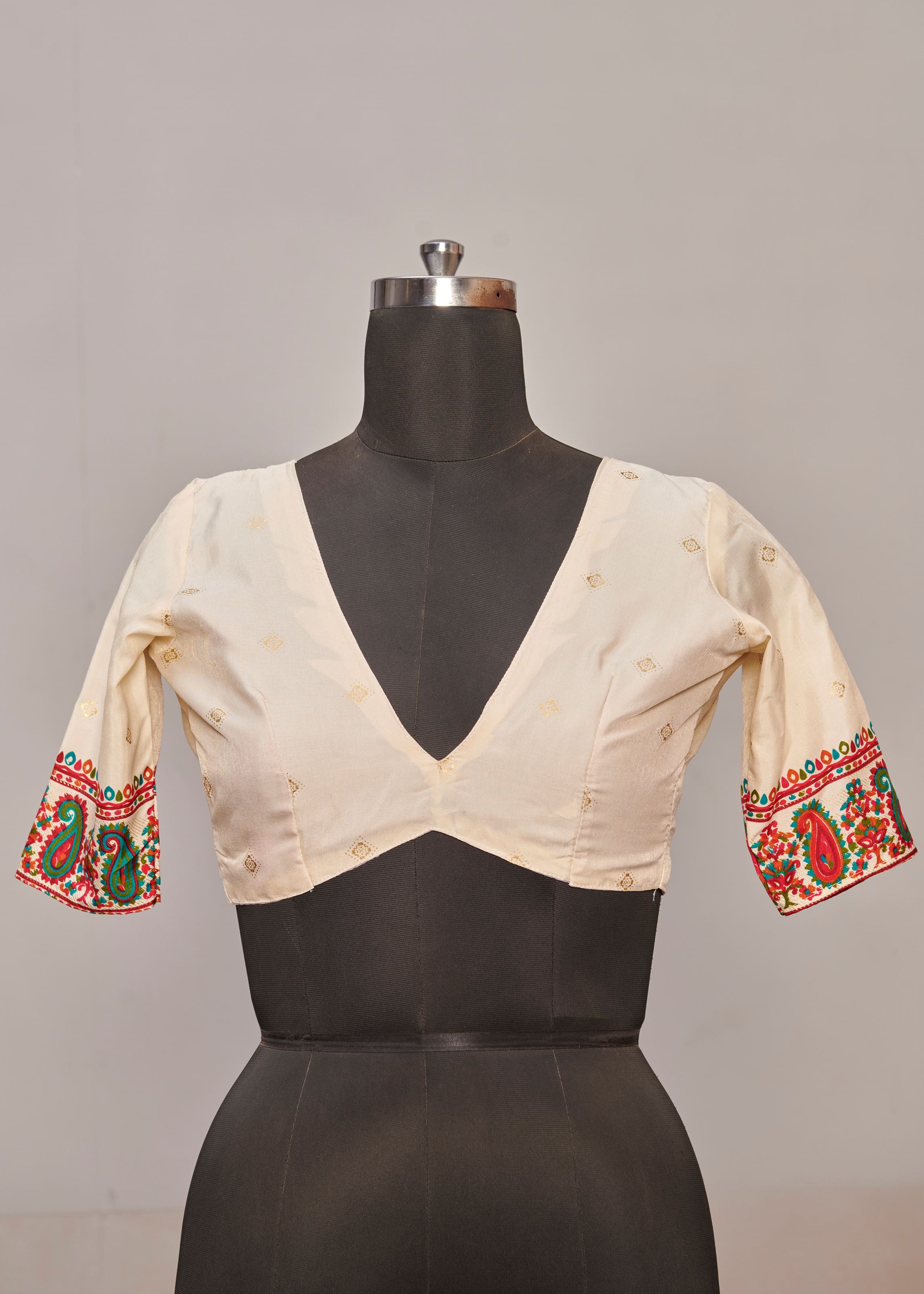 Paired with a matching off-white silk blend blouse, this saree ensures a harmonious and polished ensemble. Its lightweight yet rich texture allows for effortless draping while maintaining a majestic and refined appearance. The woven craftsmanship highlights traditional artistry, while the floral prints add a contemporary touch. Perfect for accessorizing with statement jewelry for grand occasions or subtle pieces for elegant gatherings, this saree offers versatility and charm.