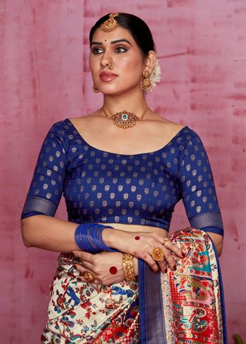 Paired with a matching dark blue silk blend blouse, this saree creates a seamless and stylish ensemble. Its lightweight fabric ensures comfortable draping while maintaining a graceful and polished appearance. The woven craftsmanship highlights traditional artistry with a contemporary flair, allowing versatile styling for both daytime events and evening gatherings. Accessorize with delicate jewelry for a refined look or bold statement pieces for a glamorous effect.